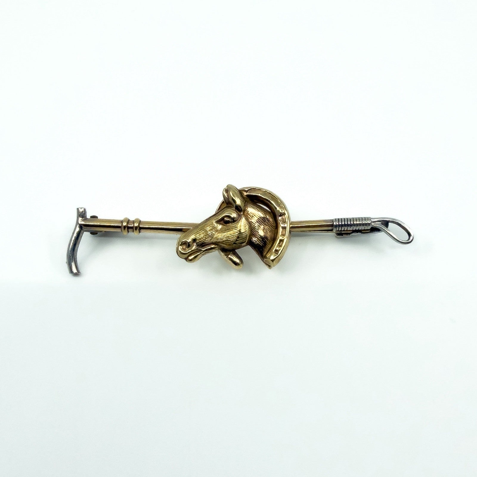 A vintage 9ct gold horse head horseshoe riding crop brooch with an equestrian design featuring a horse head, lucky horseshoe and riding crop. The white metal ends of the brooch are sterling silver.