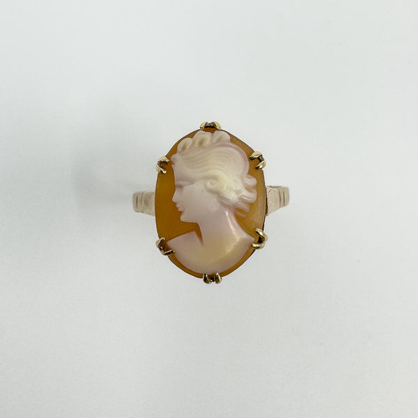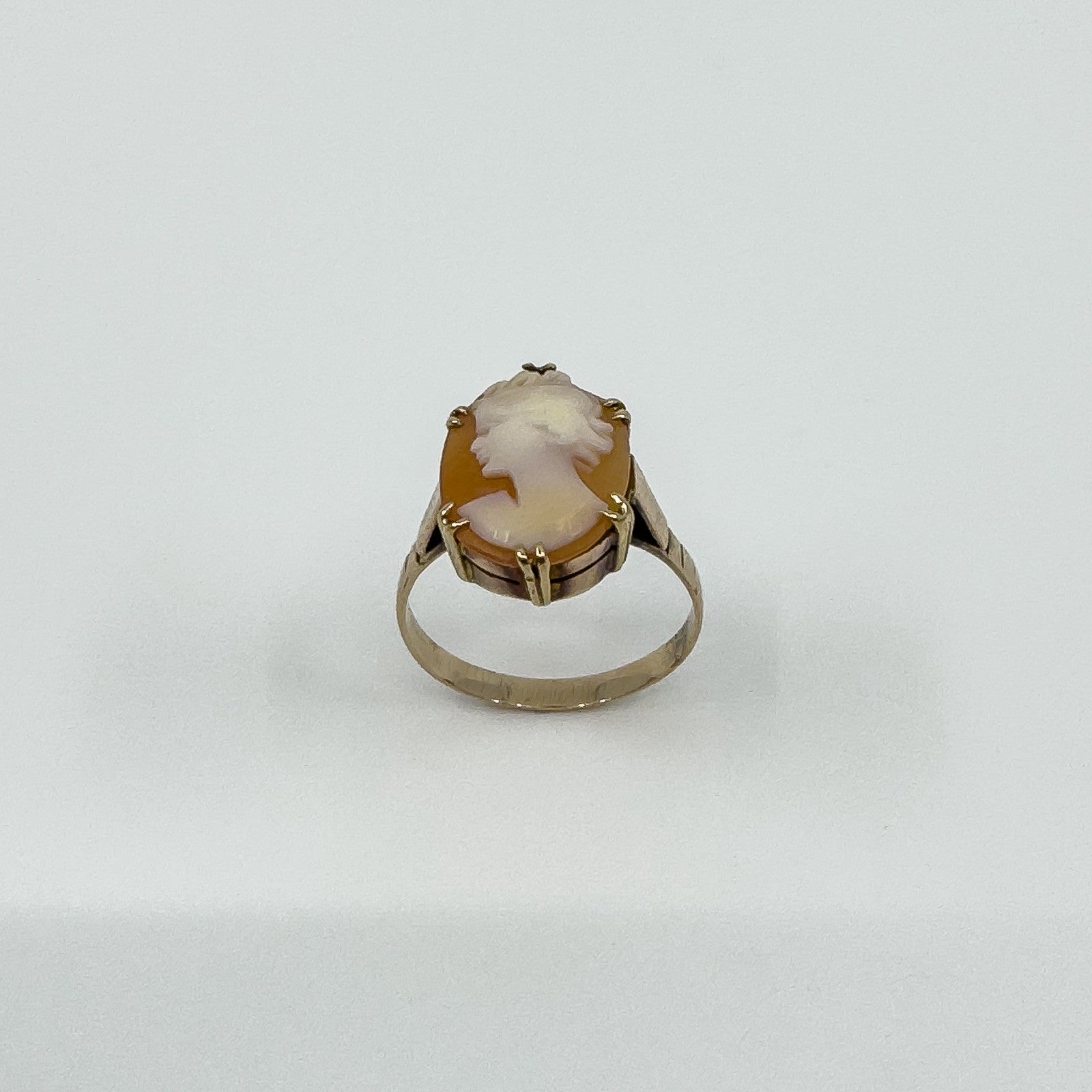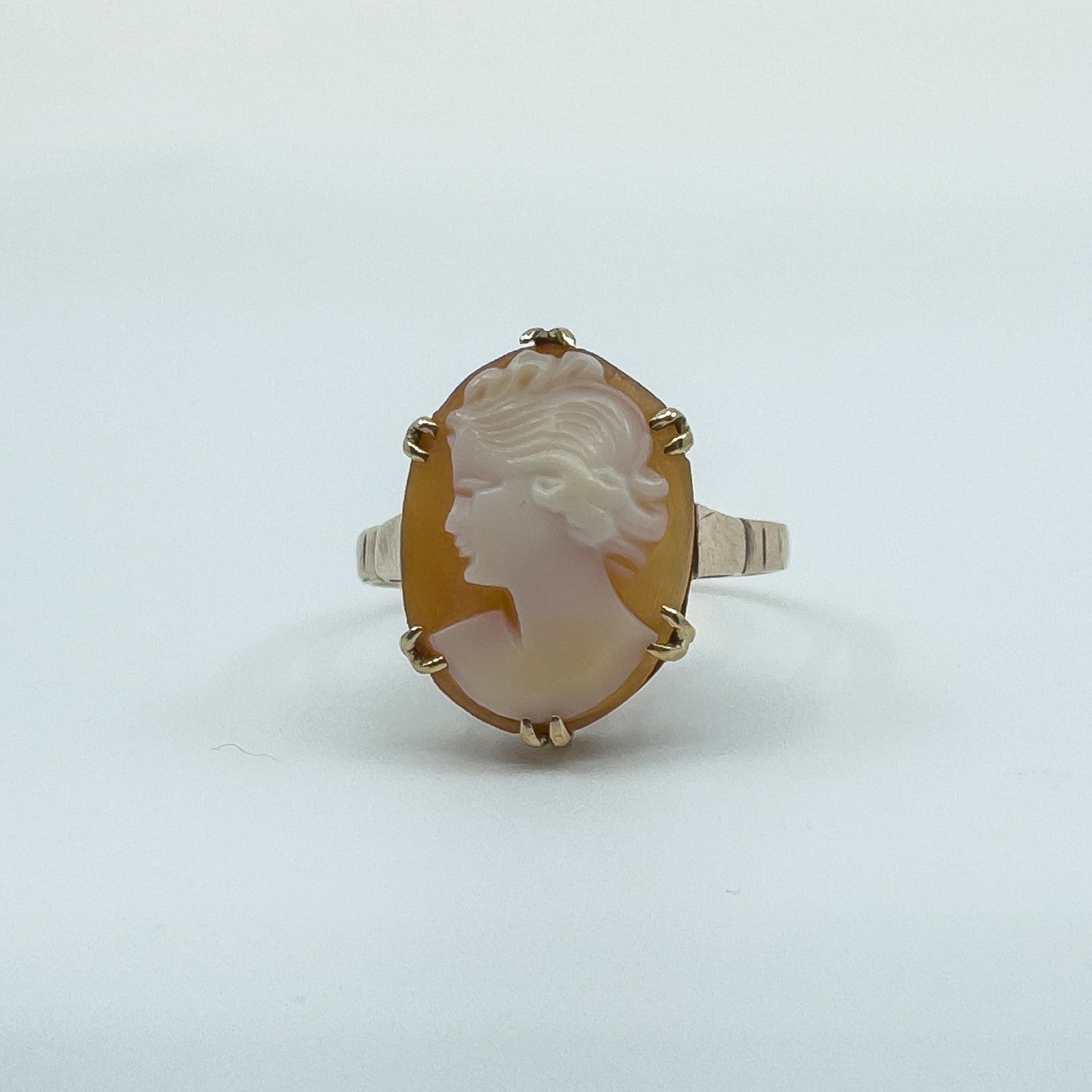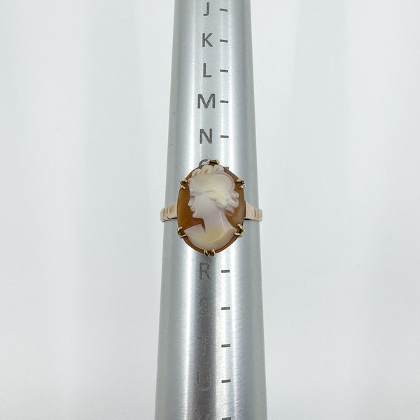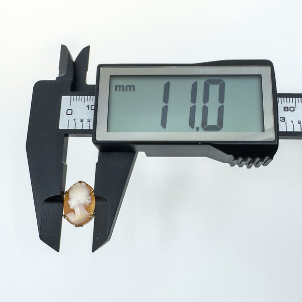 Set with 6x double prongs is a beautiful carved cameo depicting a picture of a Roman lady