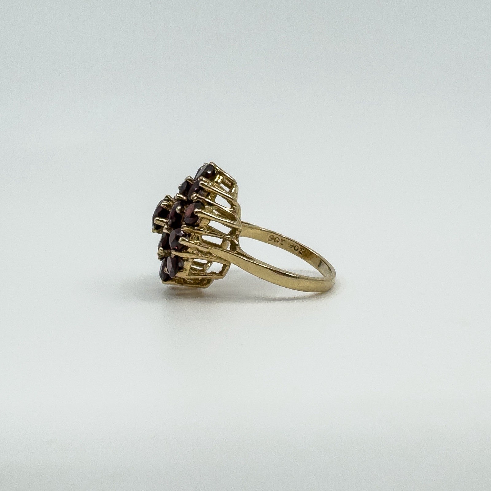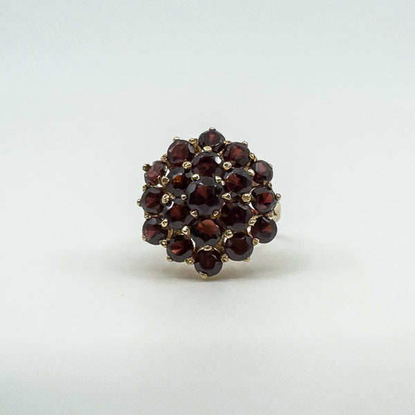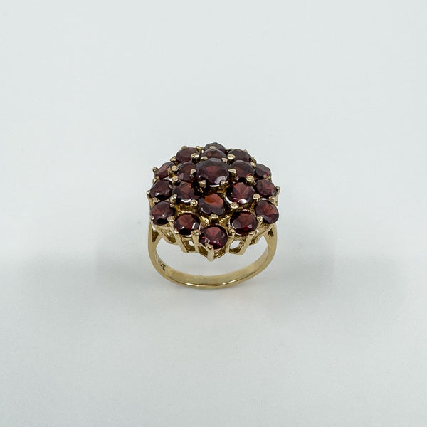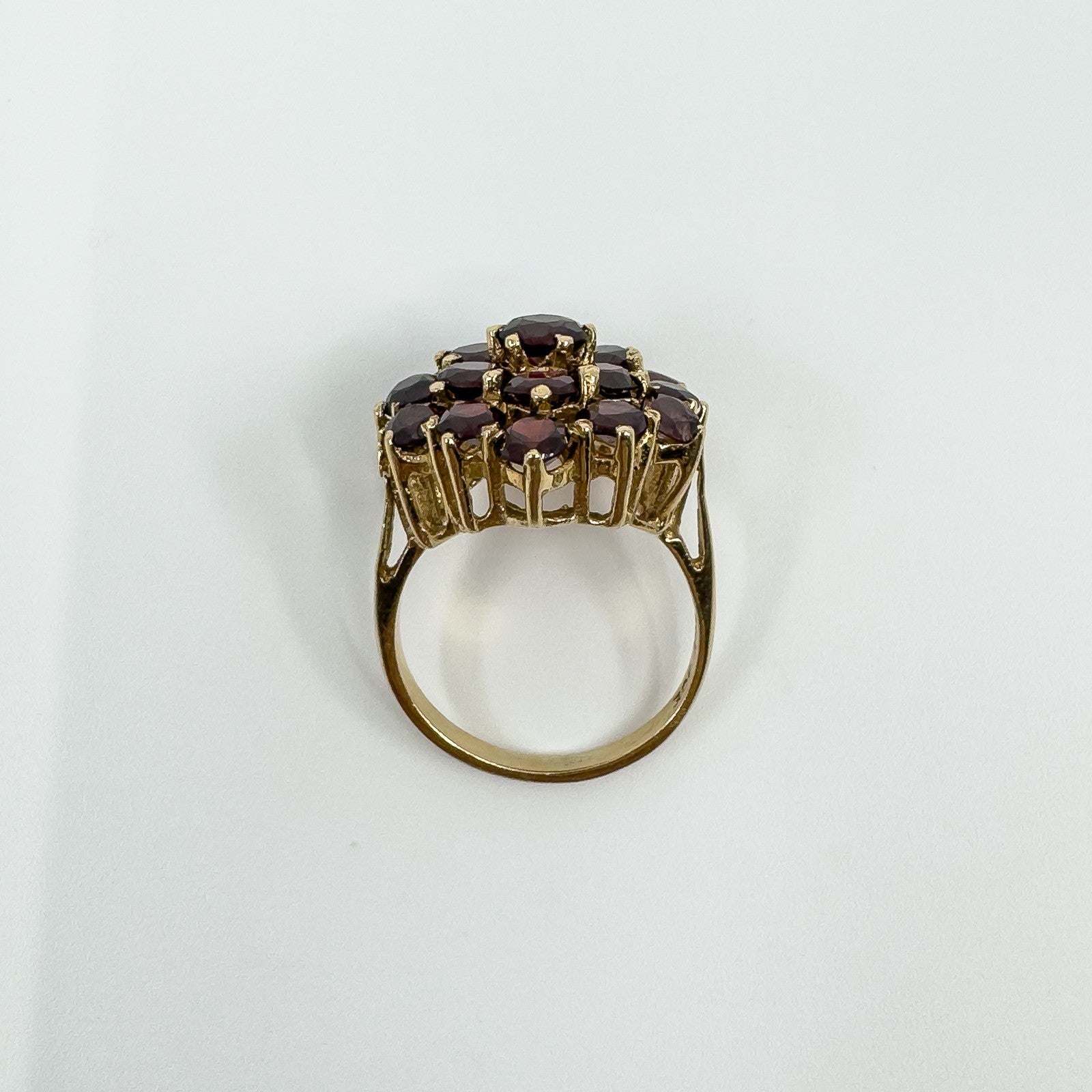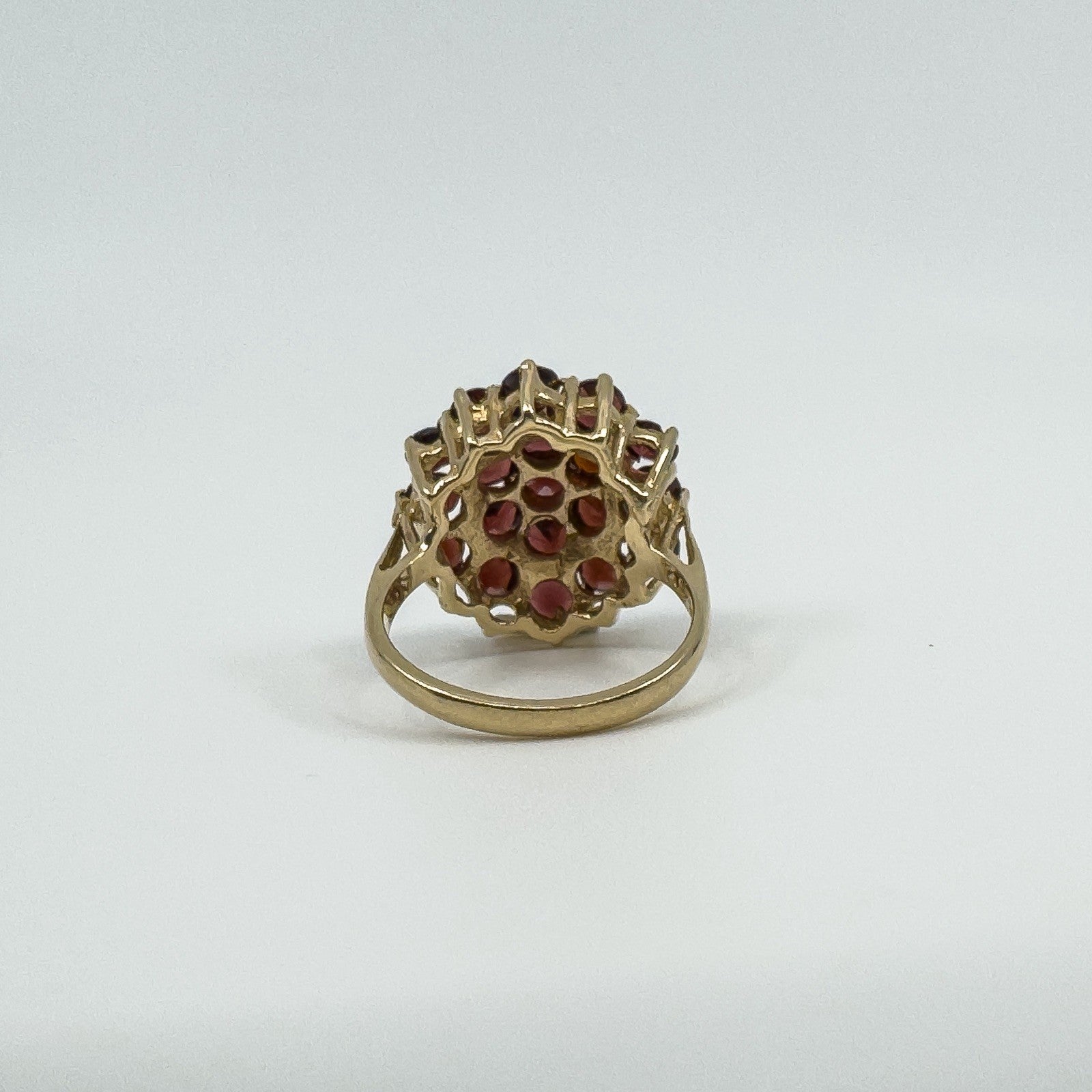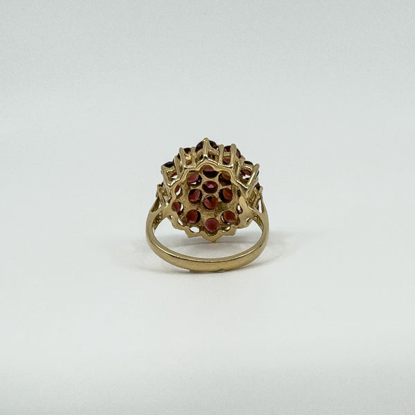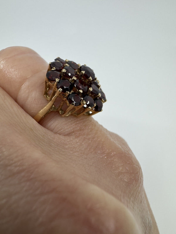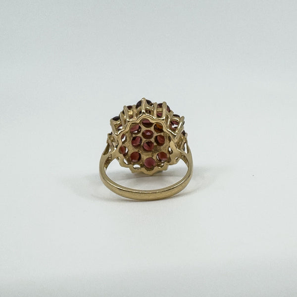A vintage 9ct yellow gold garnet cluster ring with a large head and classic cocktail look.