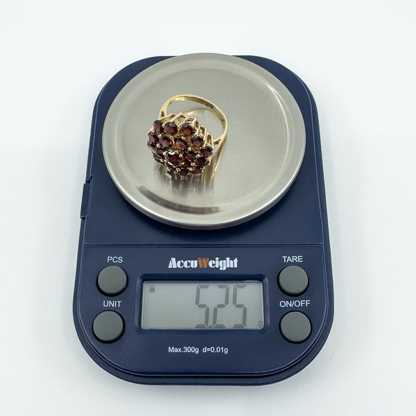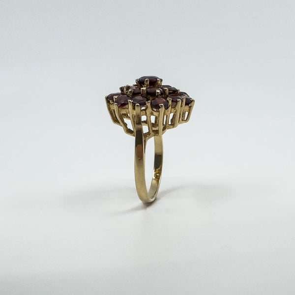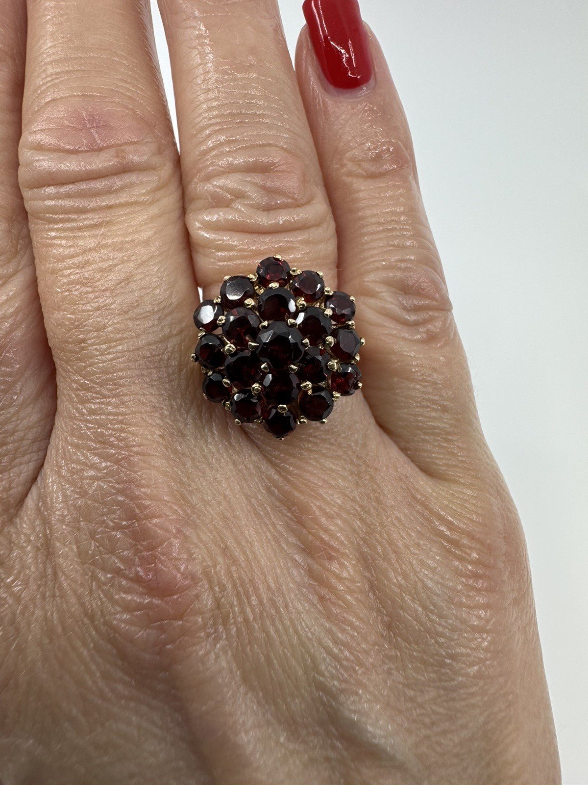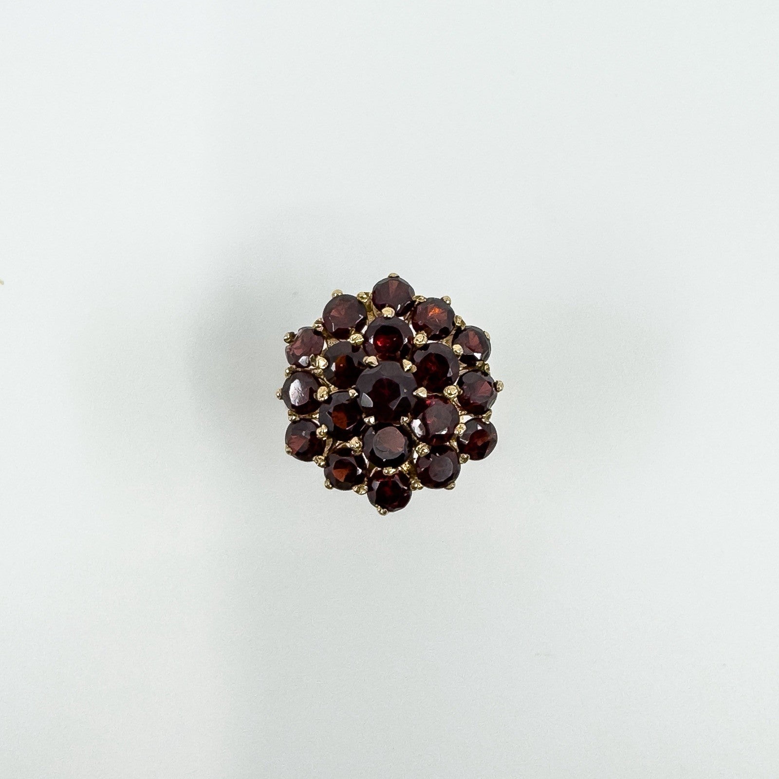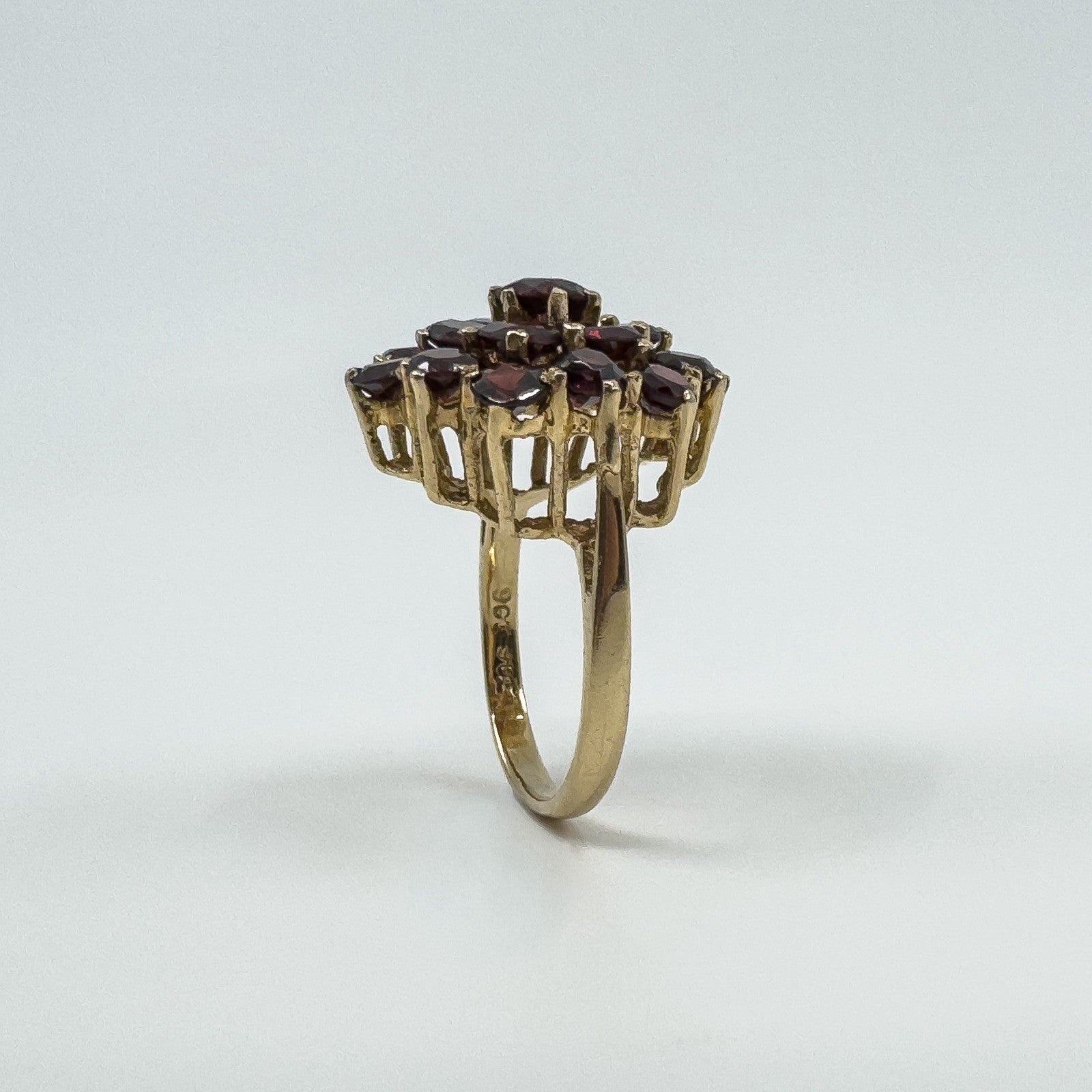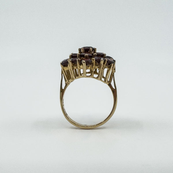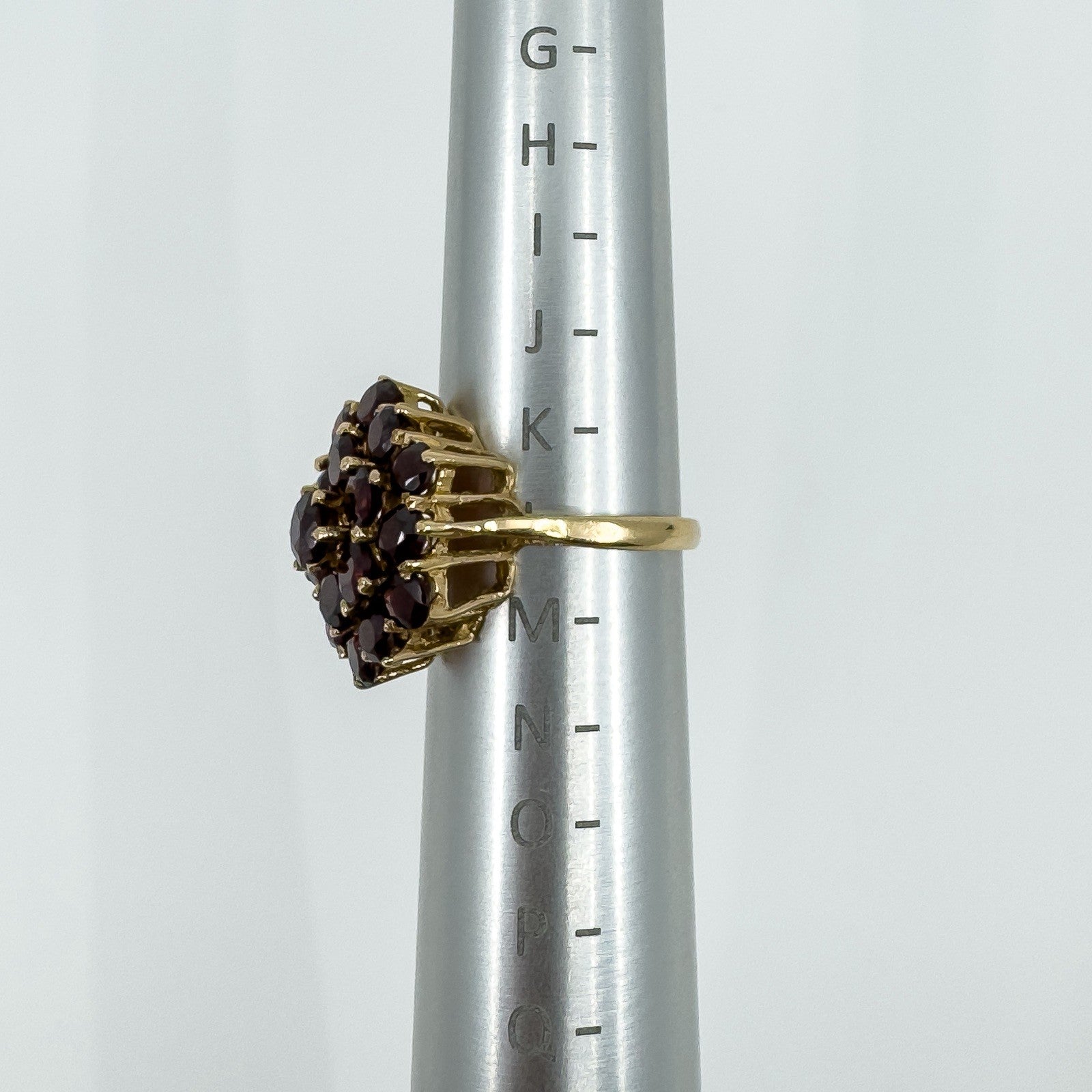 A vintage 9ct yellow gold garnet cluster ring with a large head and classic cocktail look.