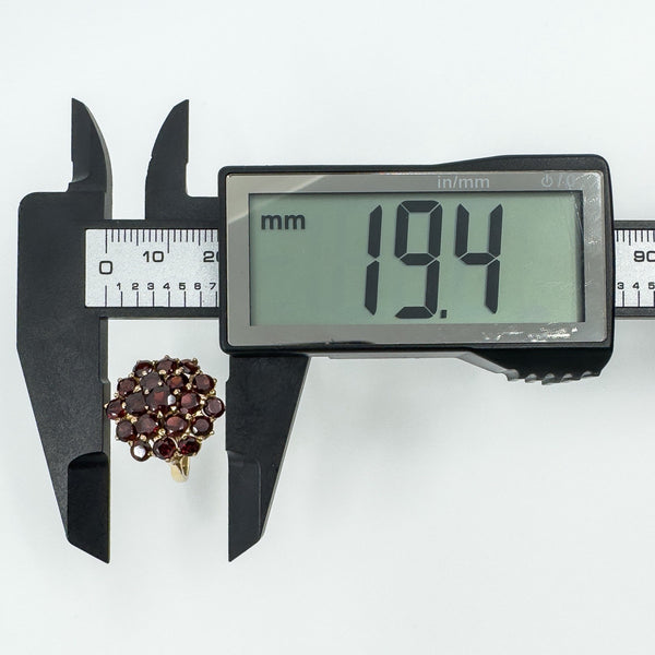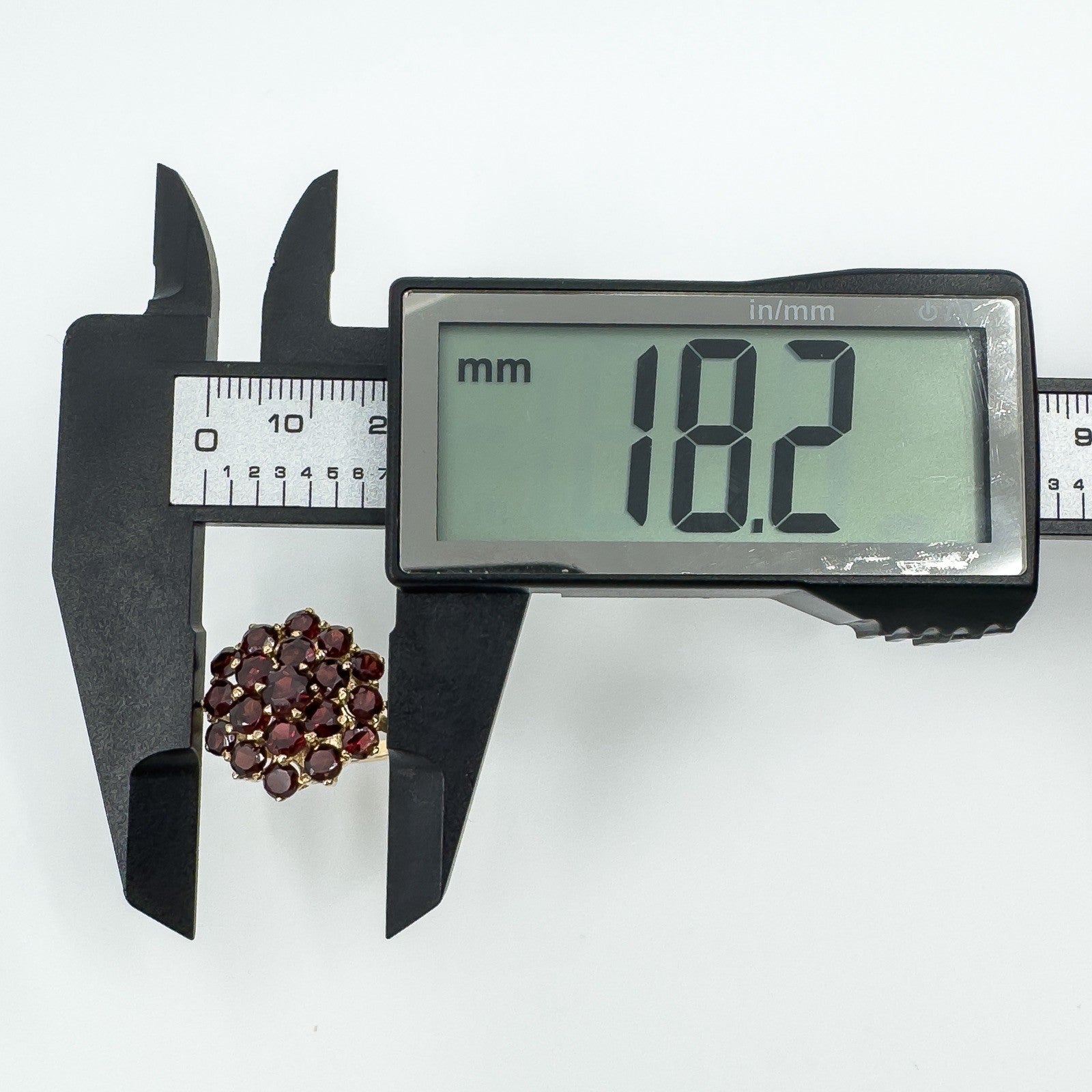 • Vintage 9ct yellow gold garnet cluster ring • Round cut natural garnets • Head measures approx. 19.4 × 18.2 mm • Depth approx. 9.6 mm (high setting) • Band underside approx. 2 mm • Weight approx. 5.2 g • Ring size L • Stamped 9ct • Small nick to one garnet edge (loupe-visible)