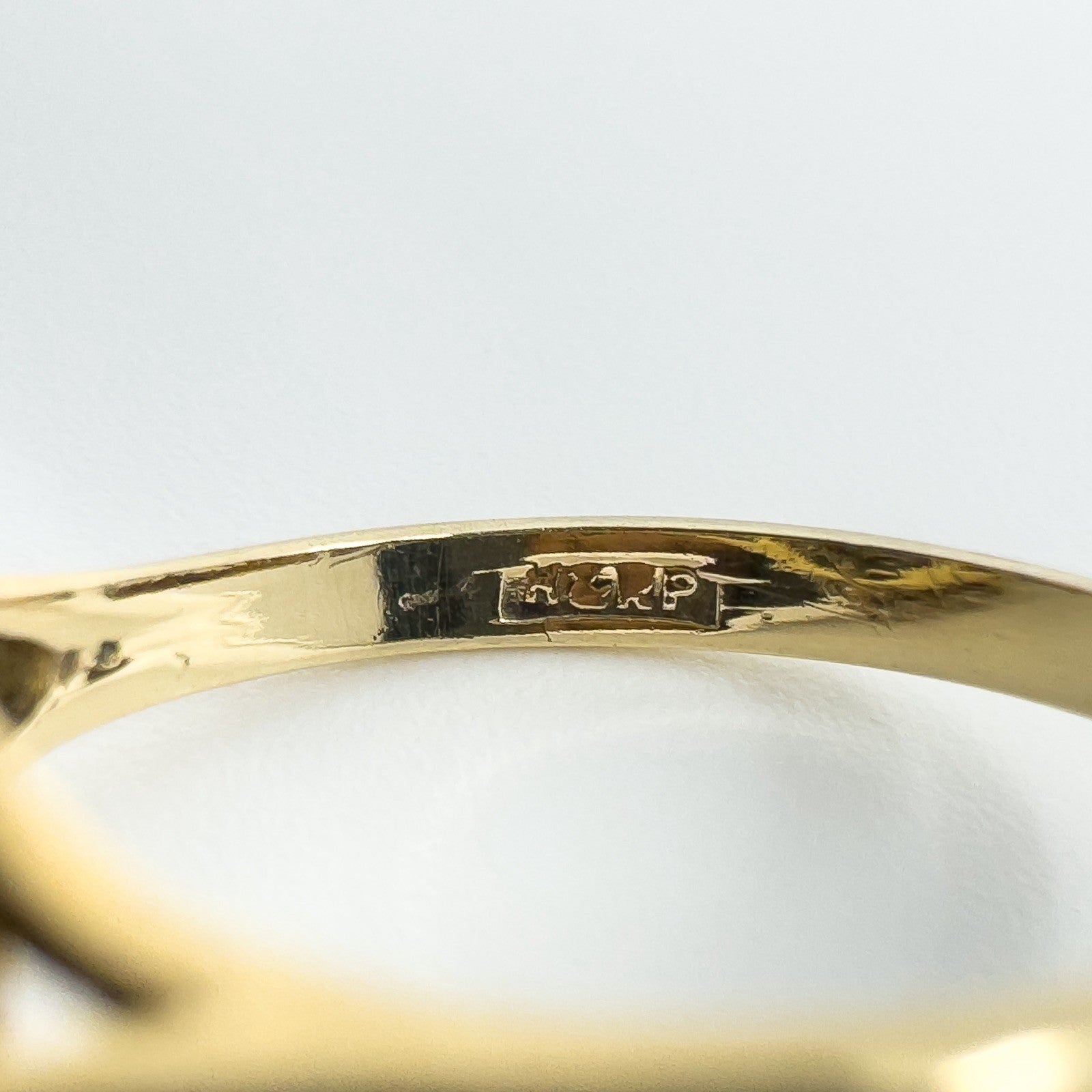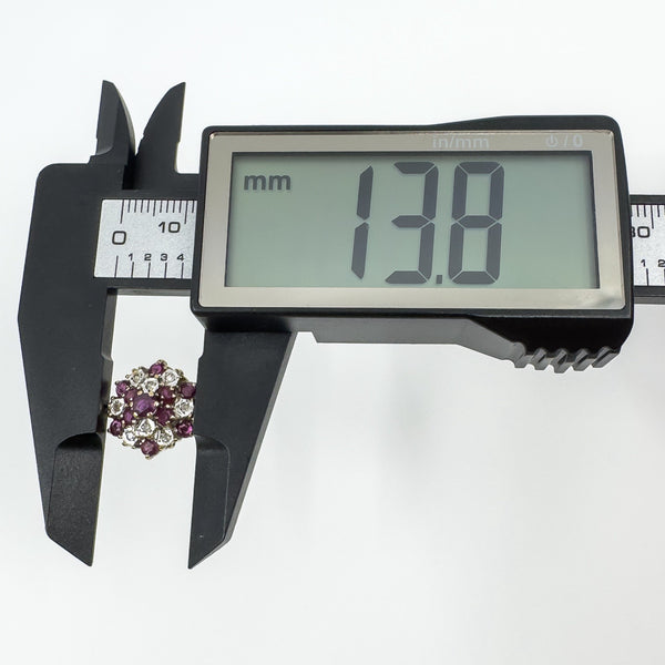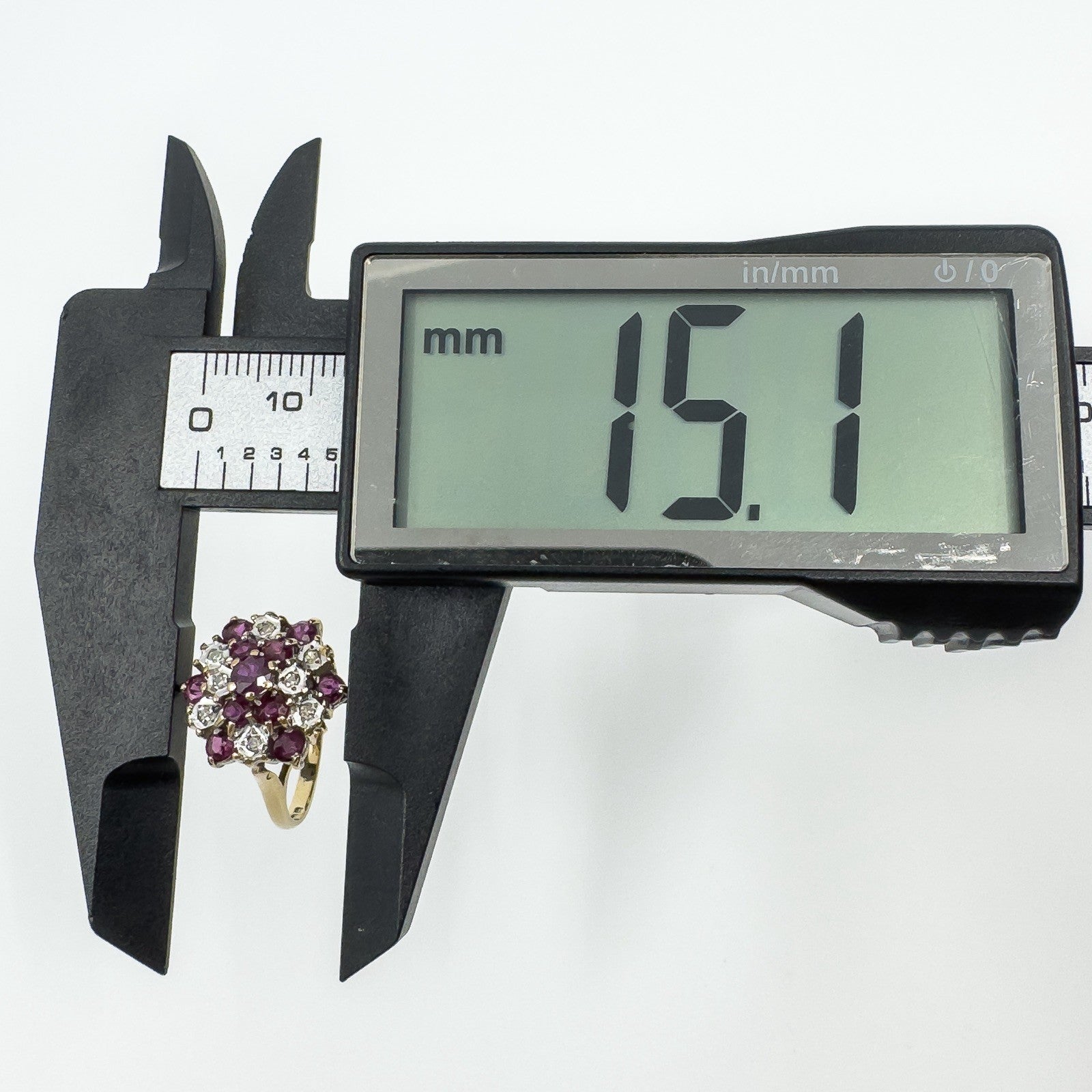 • Vintage 9ct yellow gold ruby & diamond cluster ring • 11 round cut natural rubies and 8 round cut natural diamonds • Estimated combined total ≈0.81 ct • Very high setting (depth approx. 10.4 mm) • Head measures approx. 15.1 × 13.8 mm • Band underside approx. 1.9 mm • Weight approx. 3.7 g • Ring size K • Stamped H&RP and 375