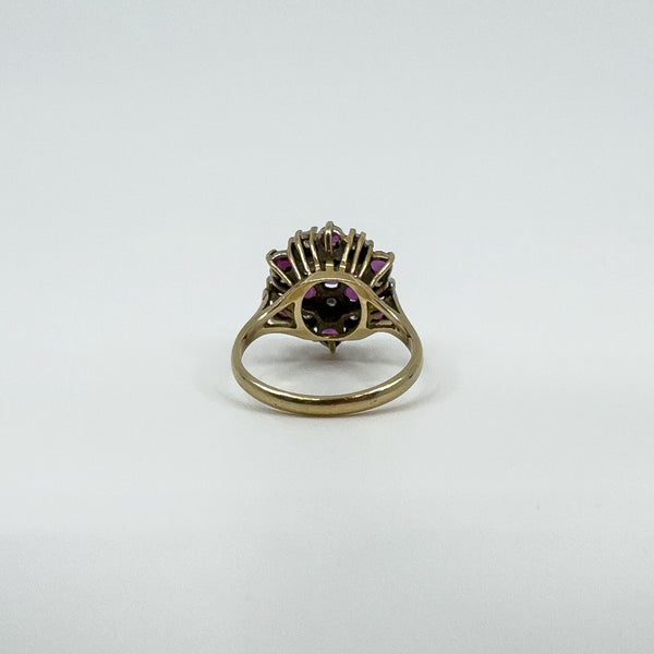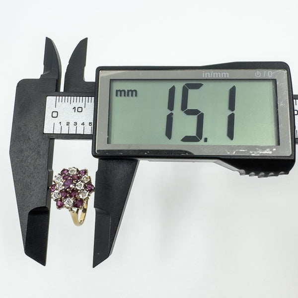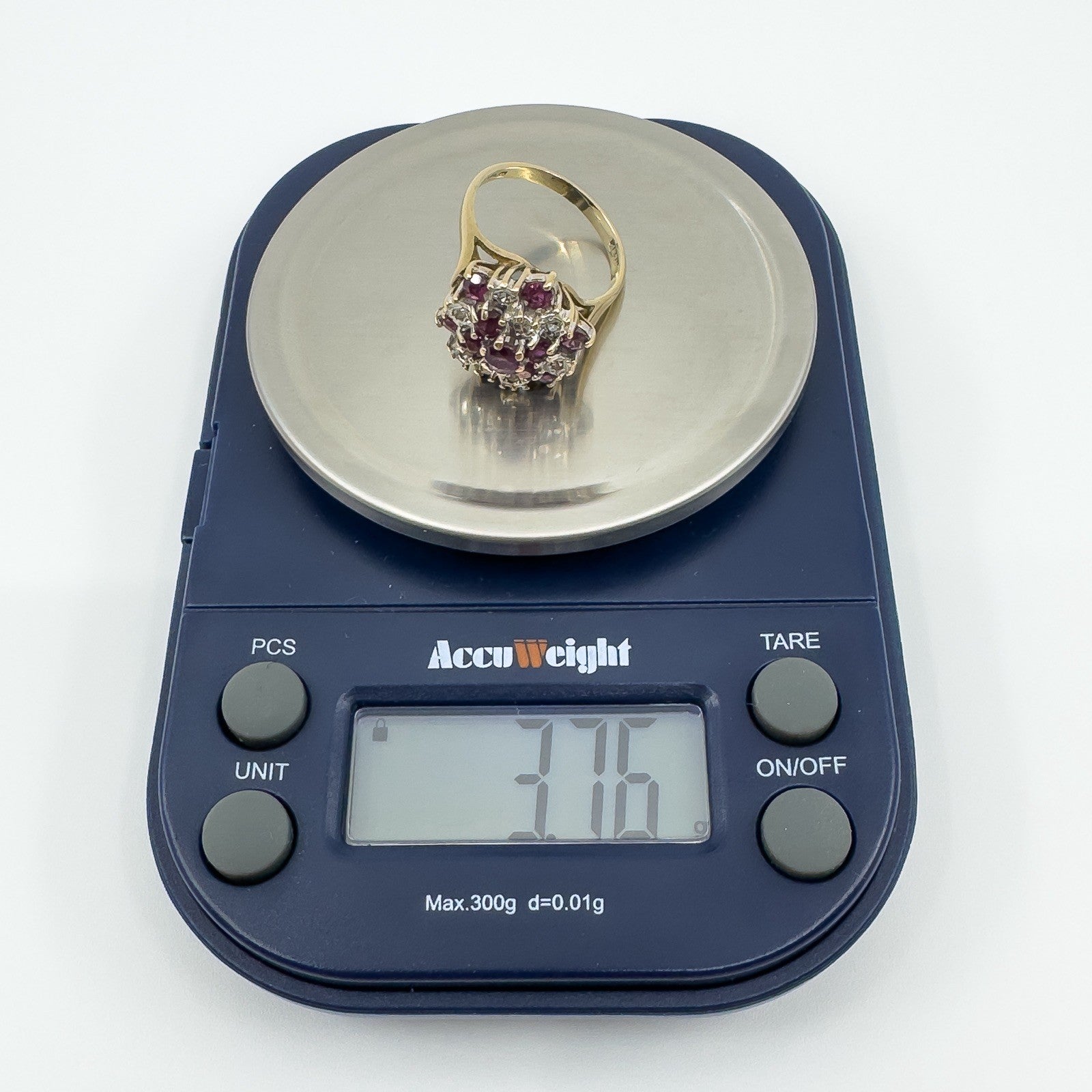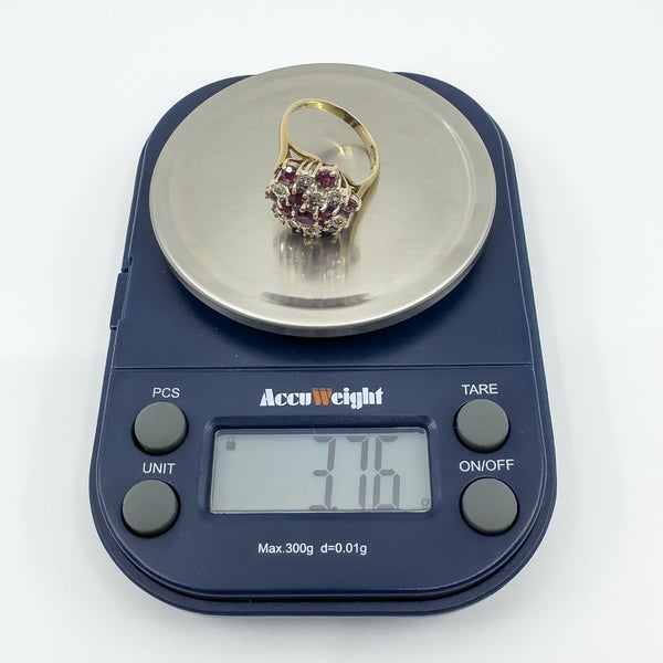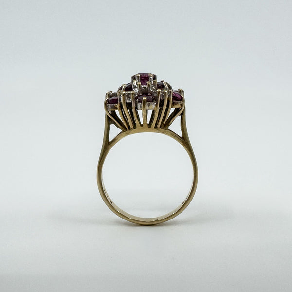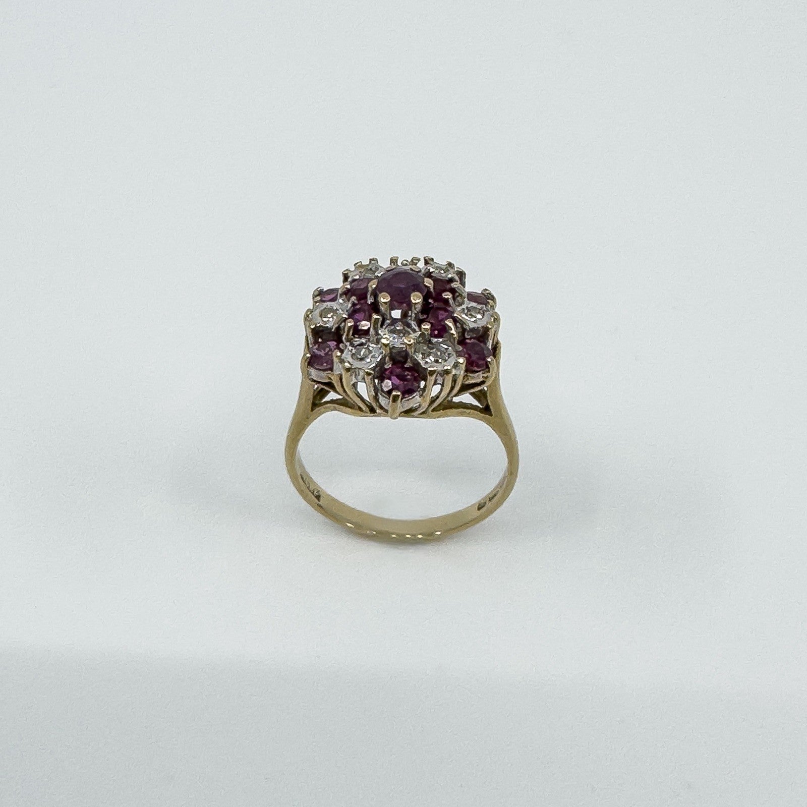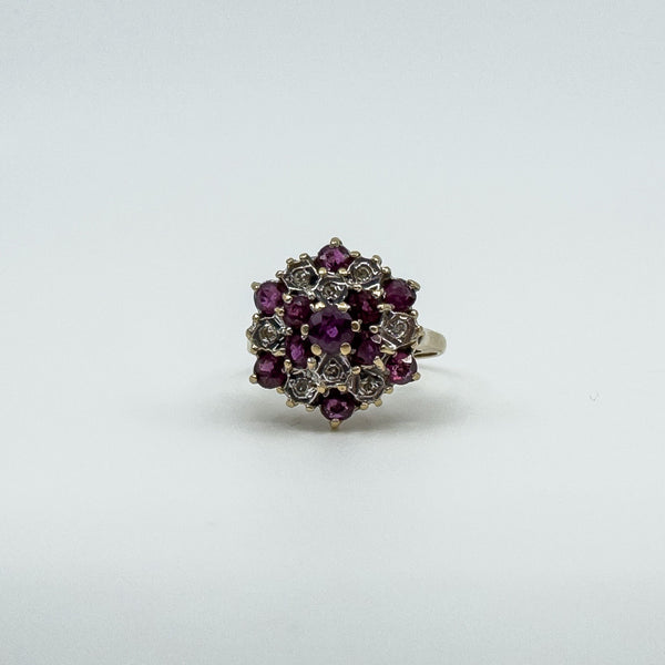 A vintage 9ct yellow gold cluster ring set with rubies and diamonds. A classic cocktail look you can wear day to day.