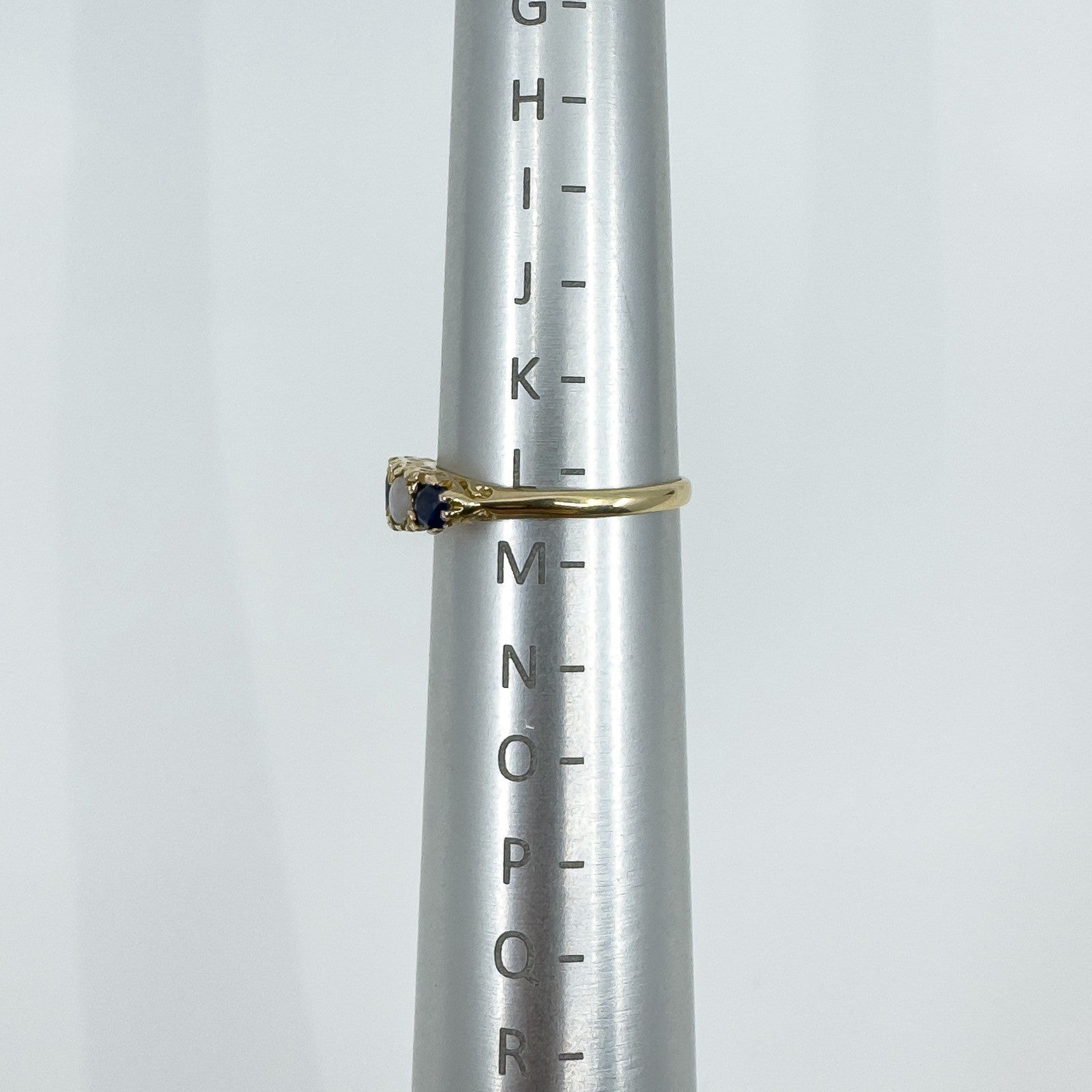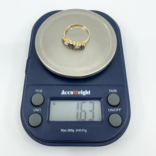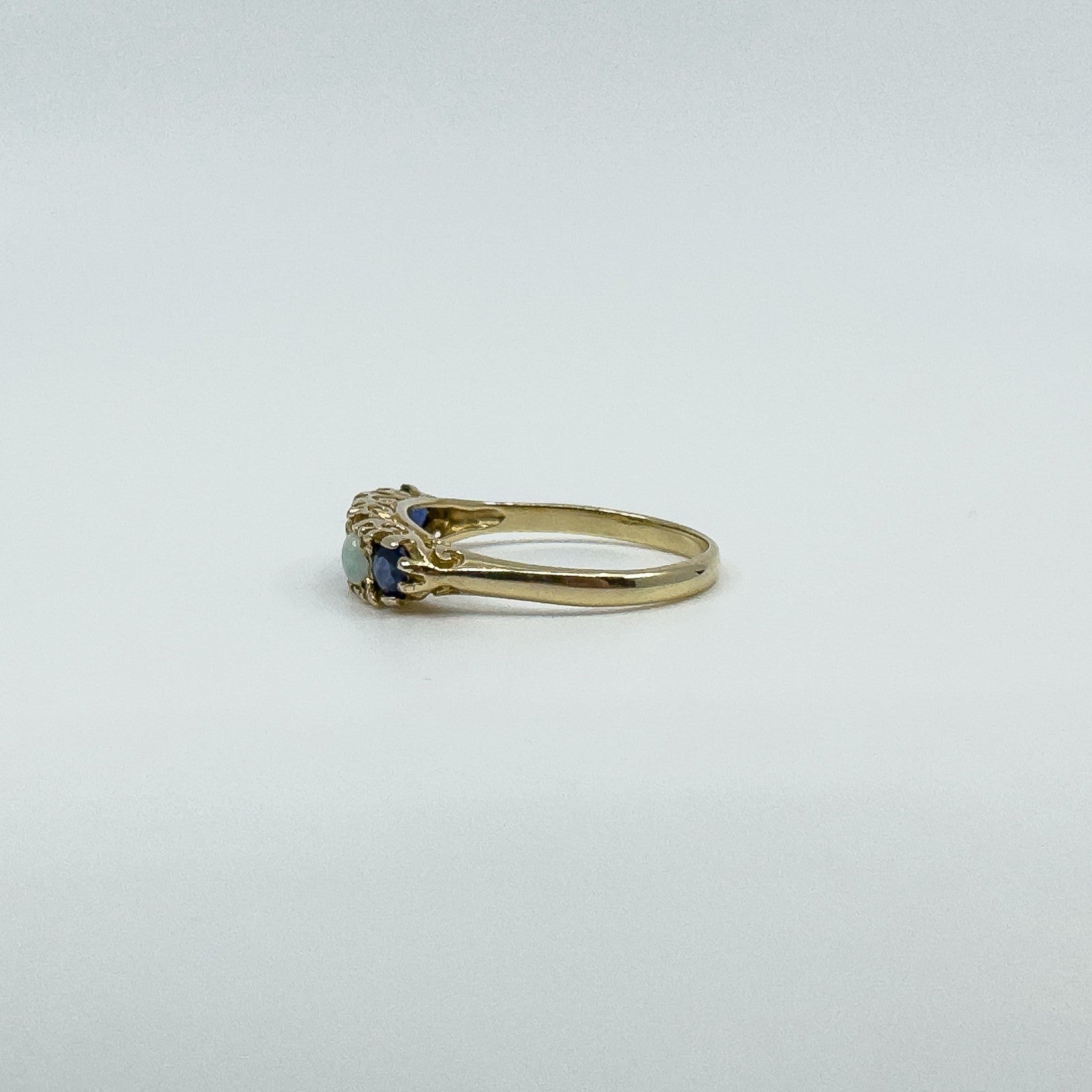 • Vintage 9ct yellow gold sapphire & opal half hoop ring• Five stones: 3 round cut natural sapphires; 2 cabochon natural opals• Head measures approx. 17 × 4.2 mm• Depth approx. 3.5 mm• Band underside approx. 1.8 mm• Weight approx. 1.6 g• Ring size L• Hallmarked BMJ; 375; Anchor (Birmingham)
