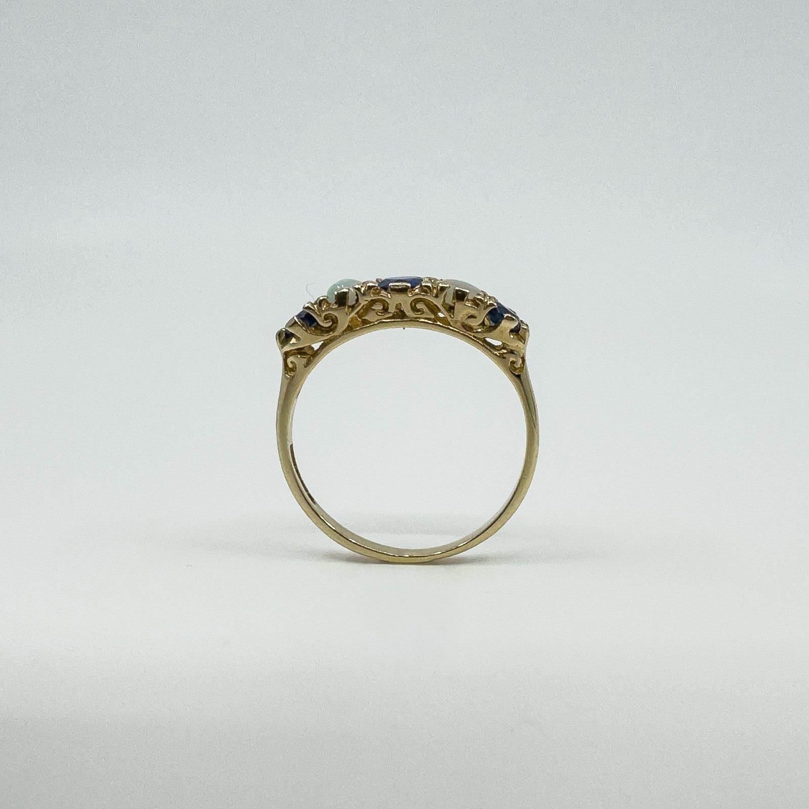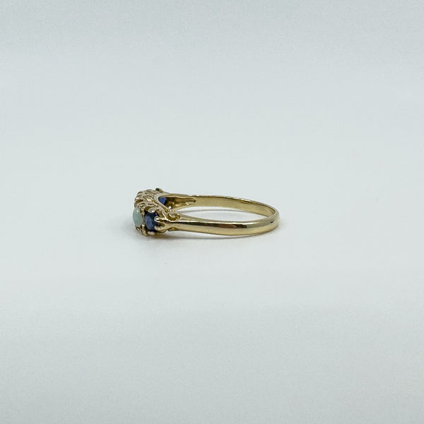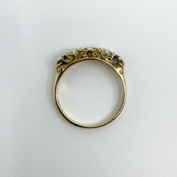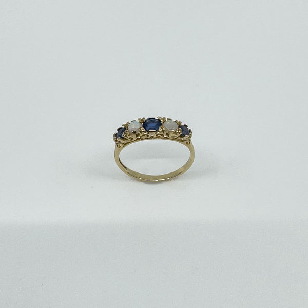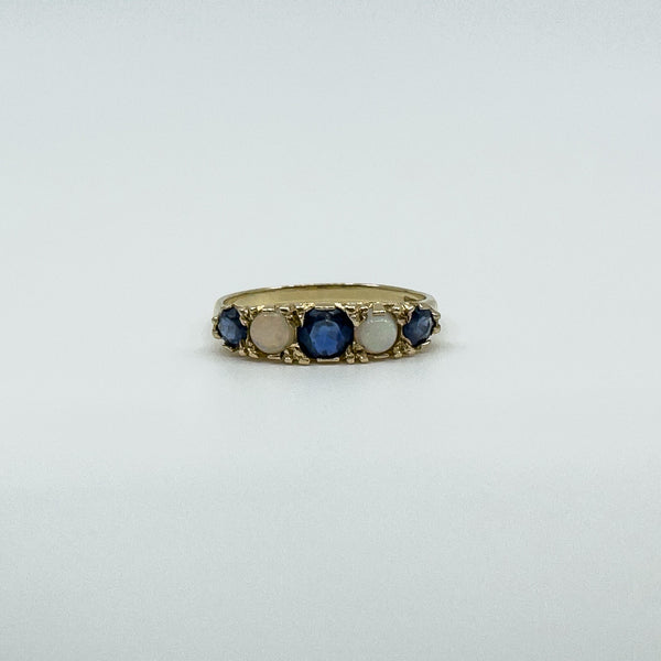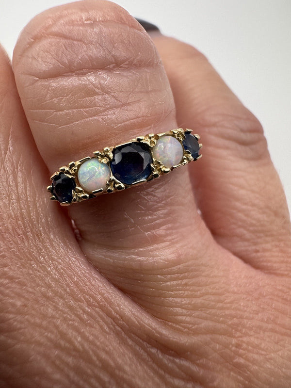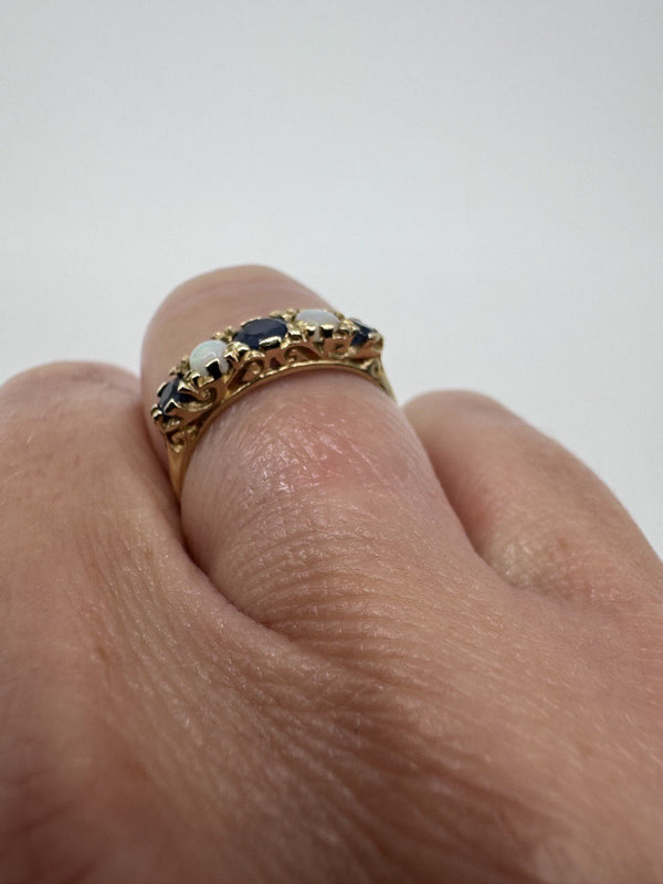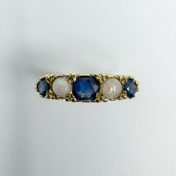 A vintage 9ct yellow gold ring set with sapphires and opals in a half hoop layout. It stacks neatly or wears well on its own.