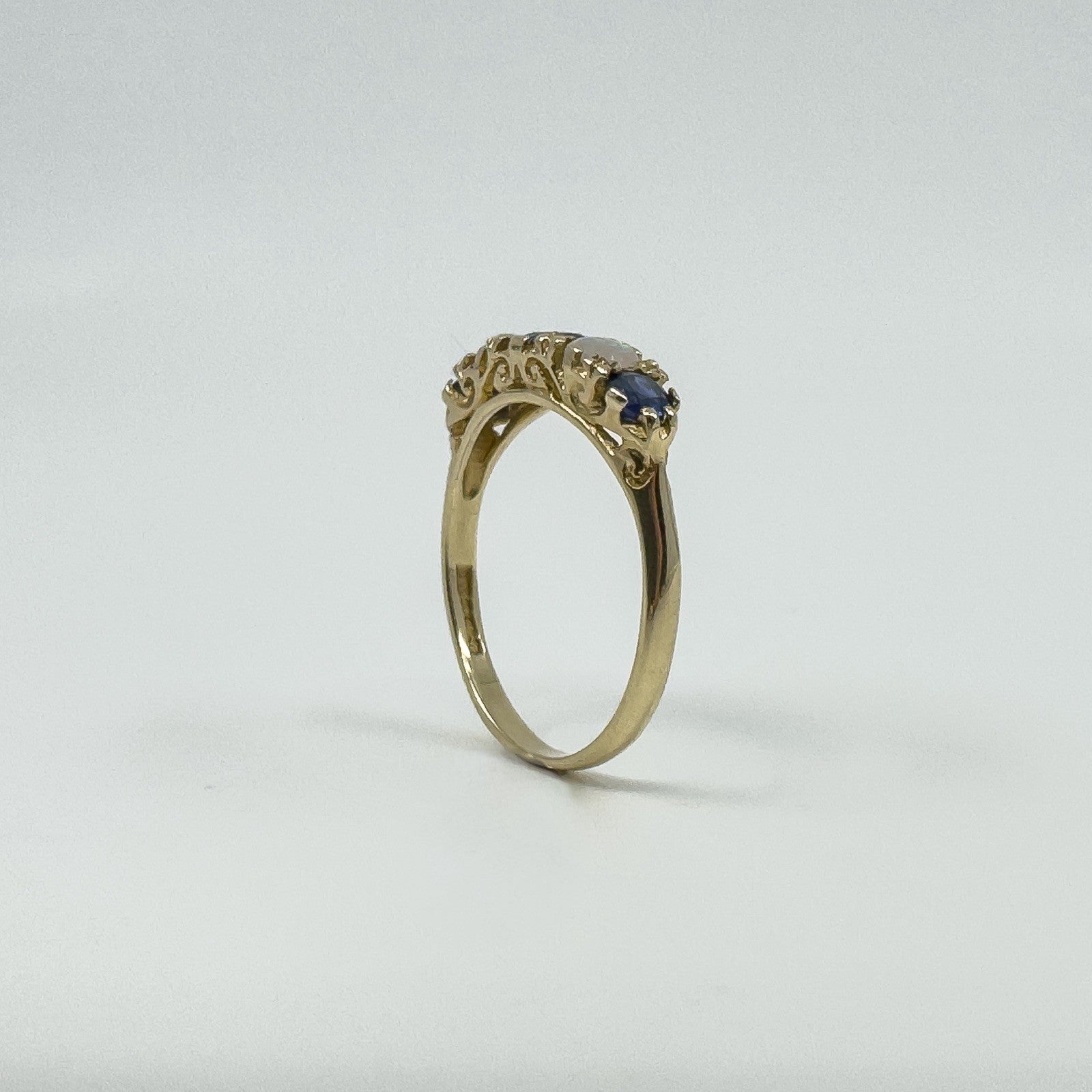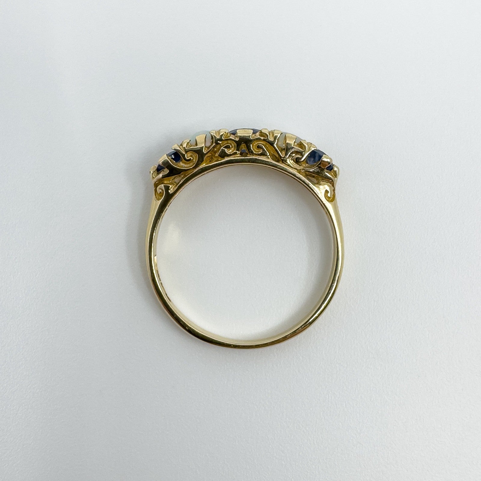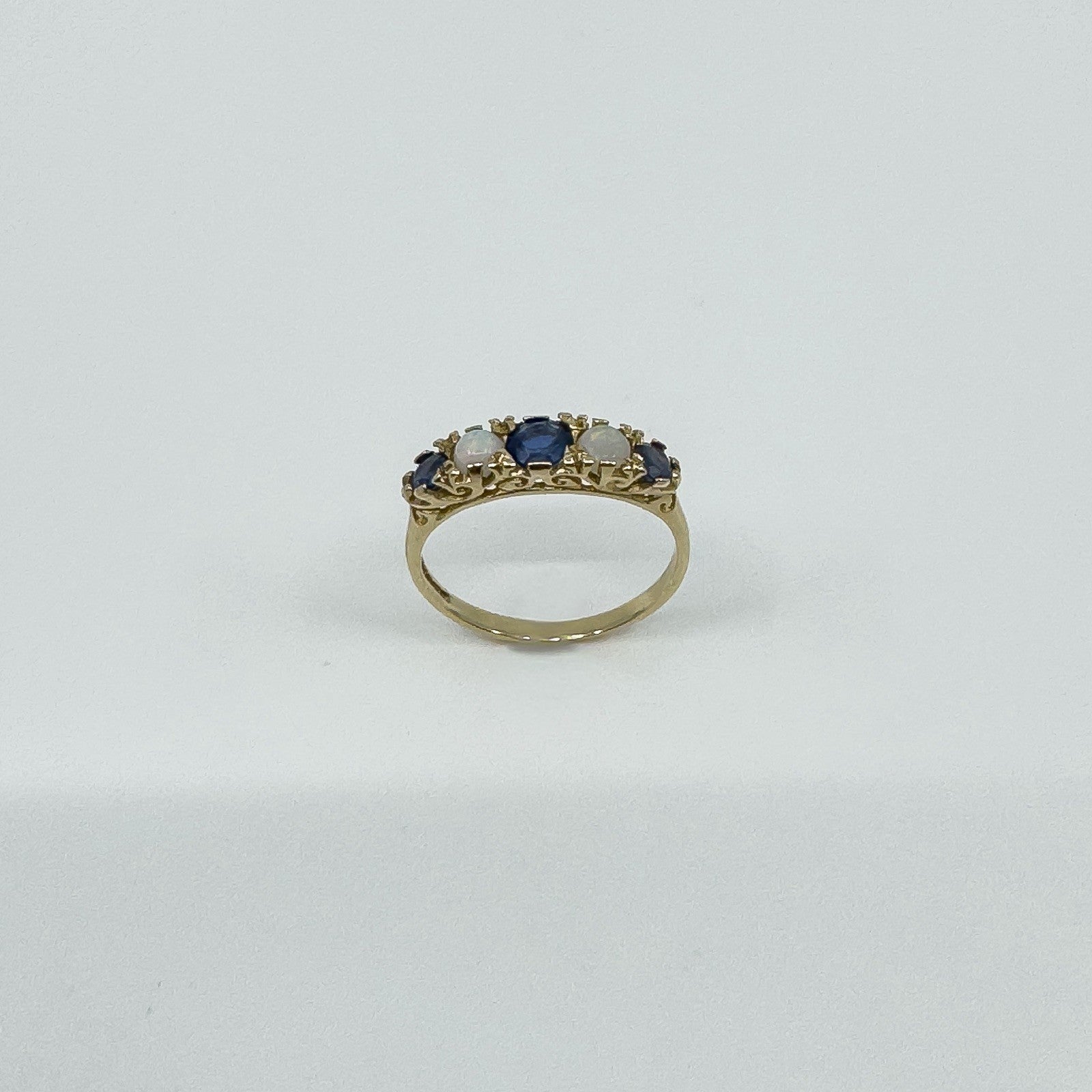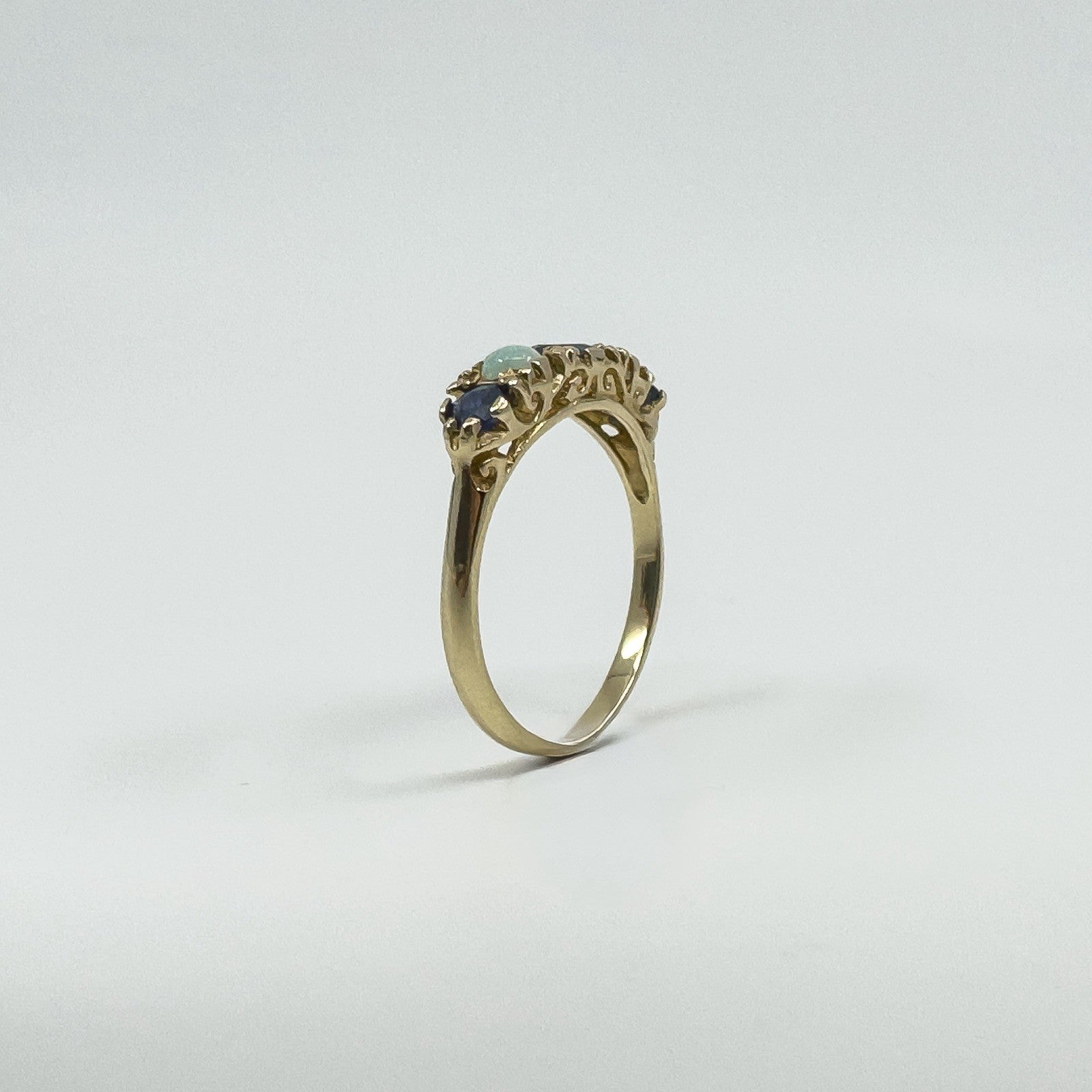 A vintage 9ct yellow gold ring set with sapphires and opals in a half hoop layout. It stacks neatly or wears well on its own.