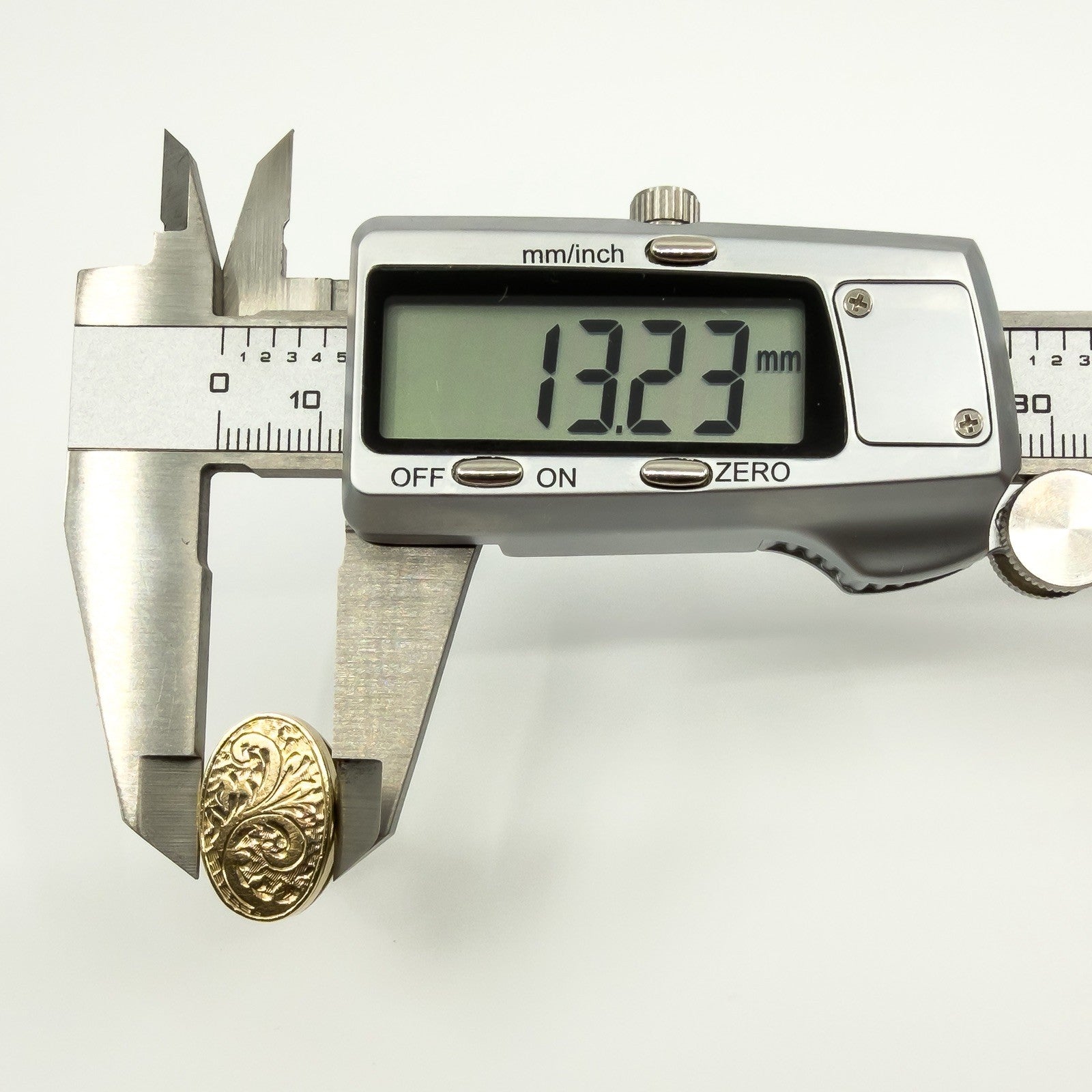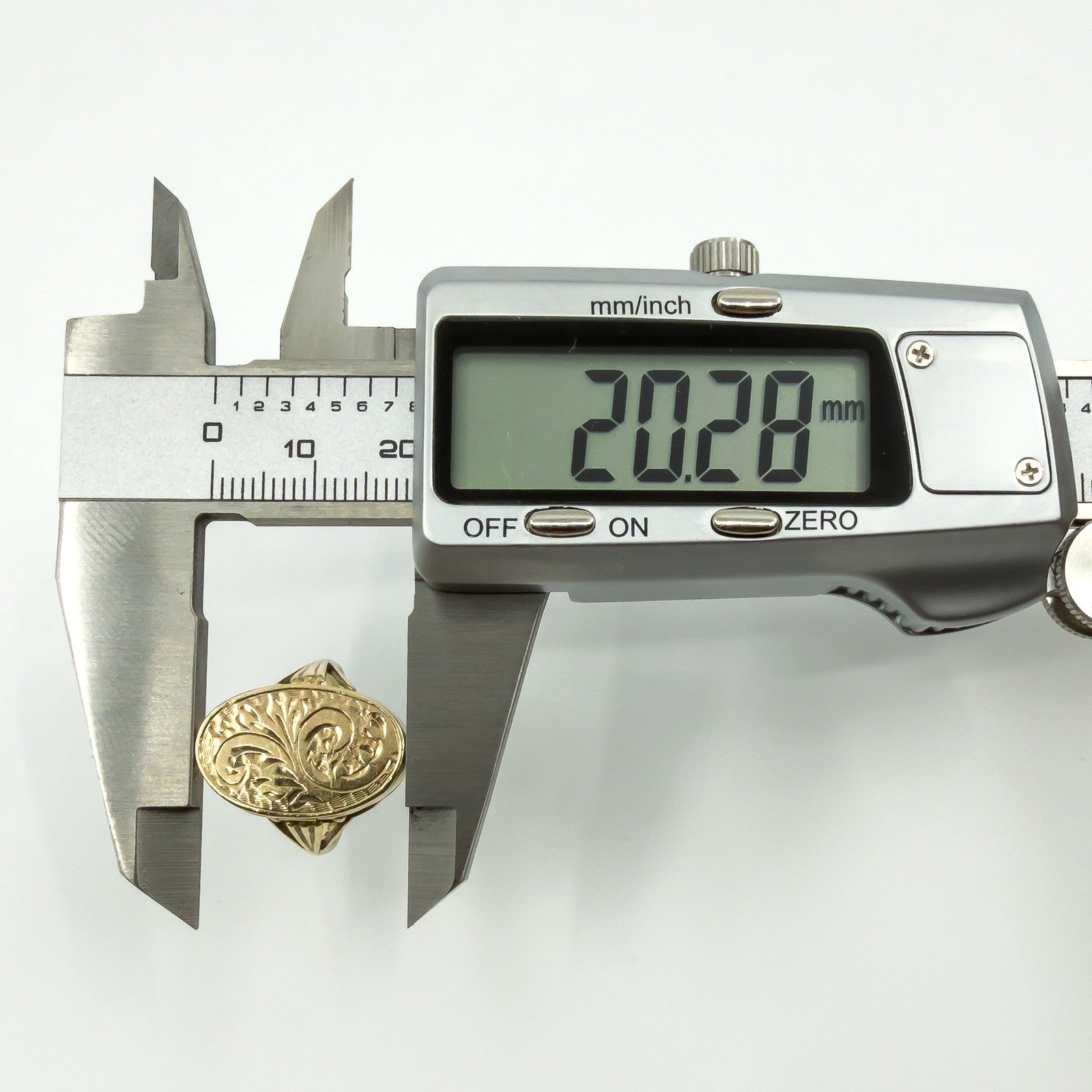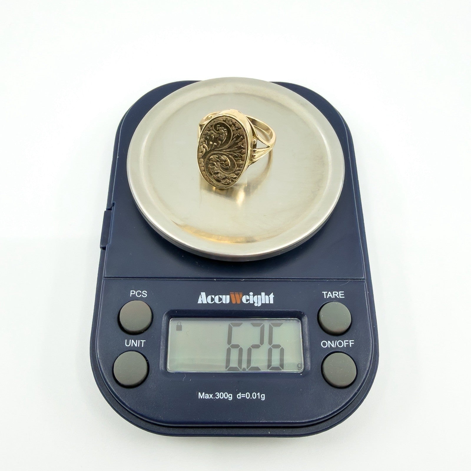 • Item: Vintage secret locket ring • Metal: 9ct gold (375) • Design: Foliate engraved locket lid • Locket: Hinged opening with space for a photo or small keepsake • Ring size: Size O • Head size: Approx. 20.2mm x 13.2mm • Band width: Approx. 2.3mm • Depth: Approx. 4.1mm • Weight: Approx. 6.2g • Assay office: Birmingham • Year: 1975 • Hallmarks: PCB, crown, 375, Anchor, A (Birmingham 1975)