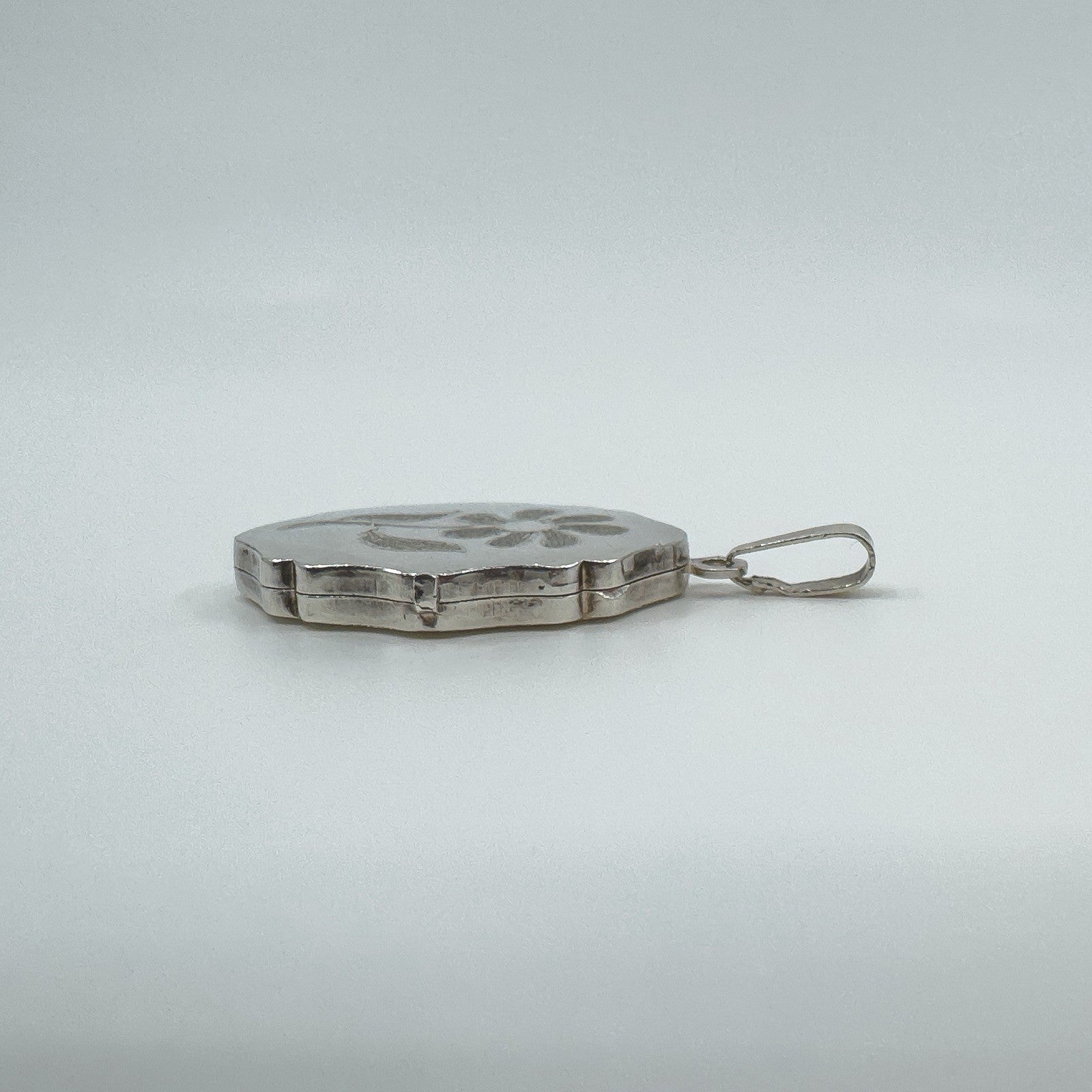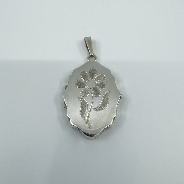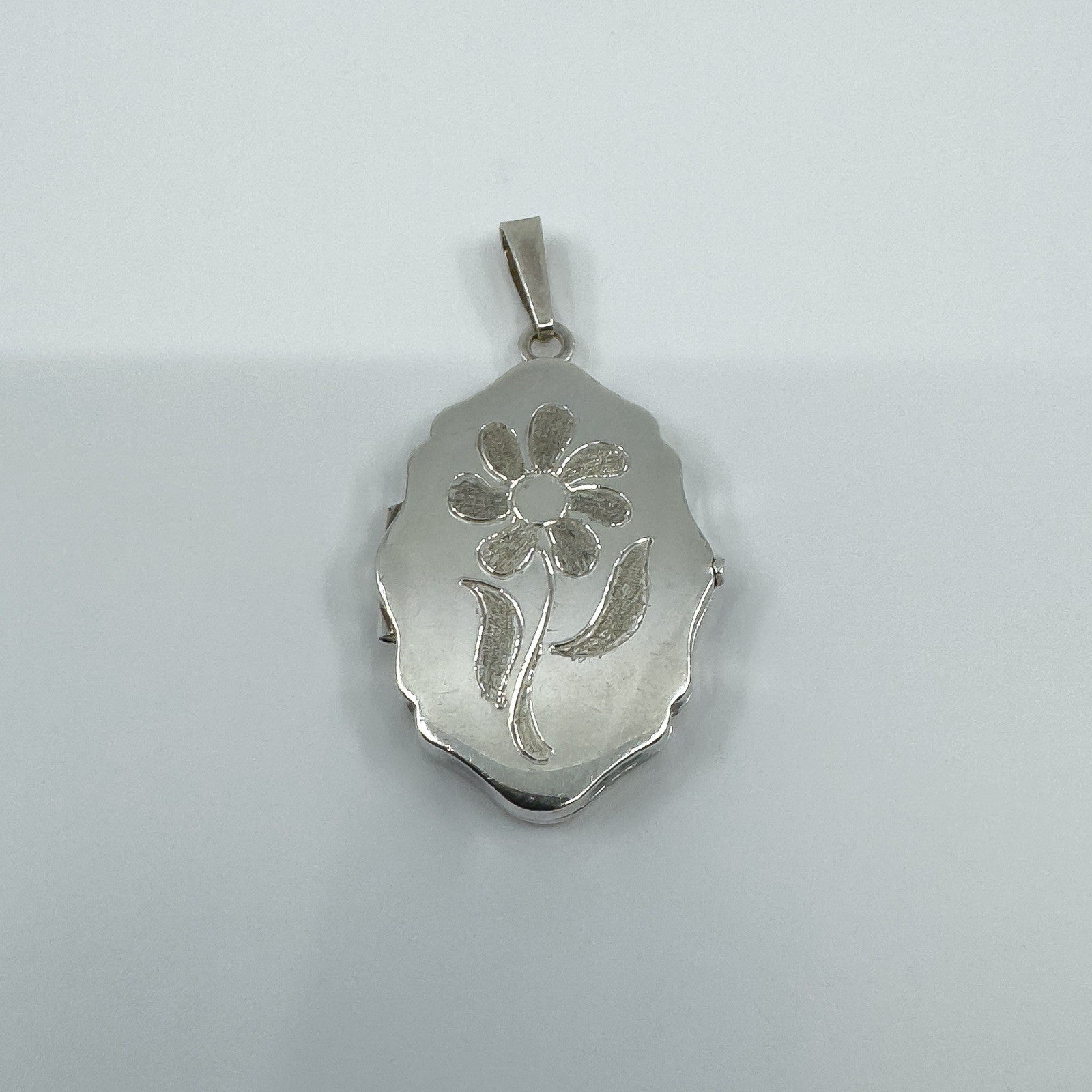 A vintage chunky sterling silver oval locket with a floral engraved front.