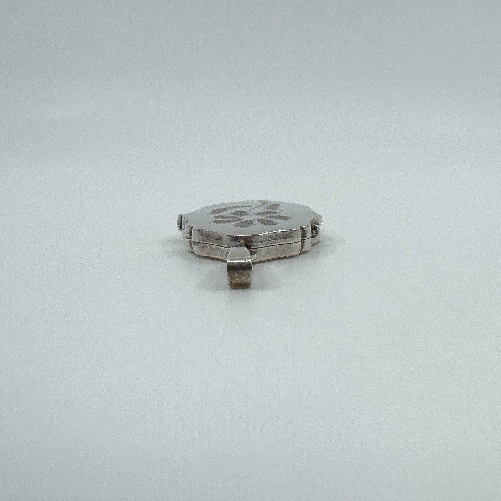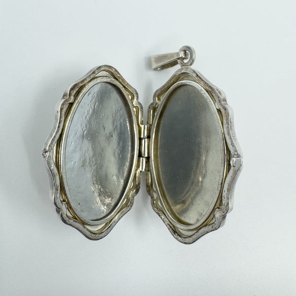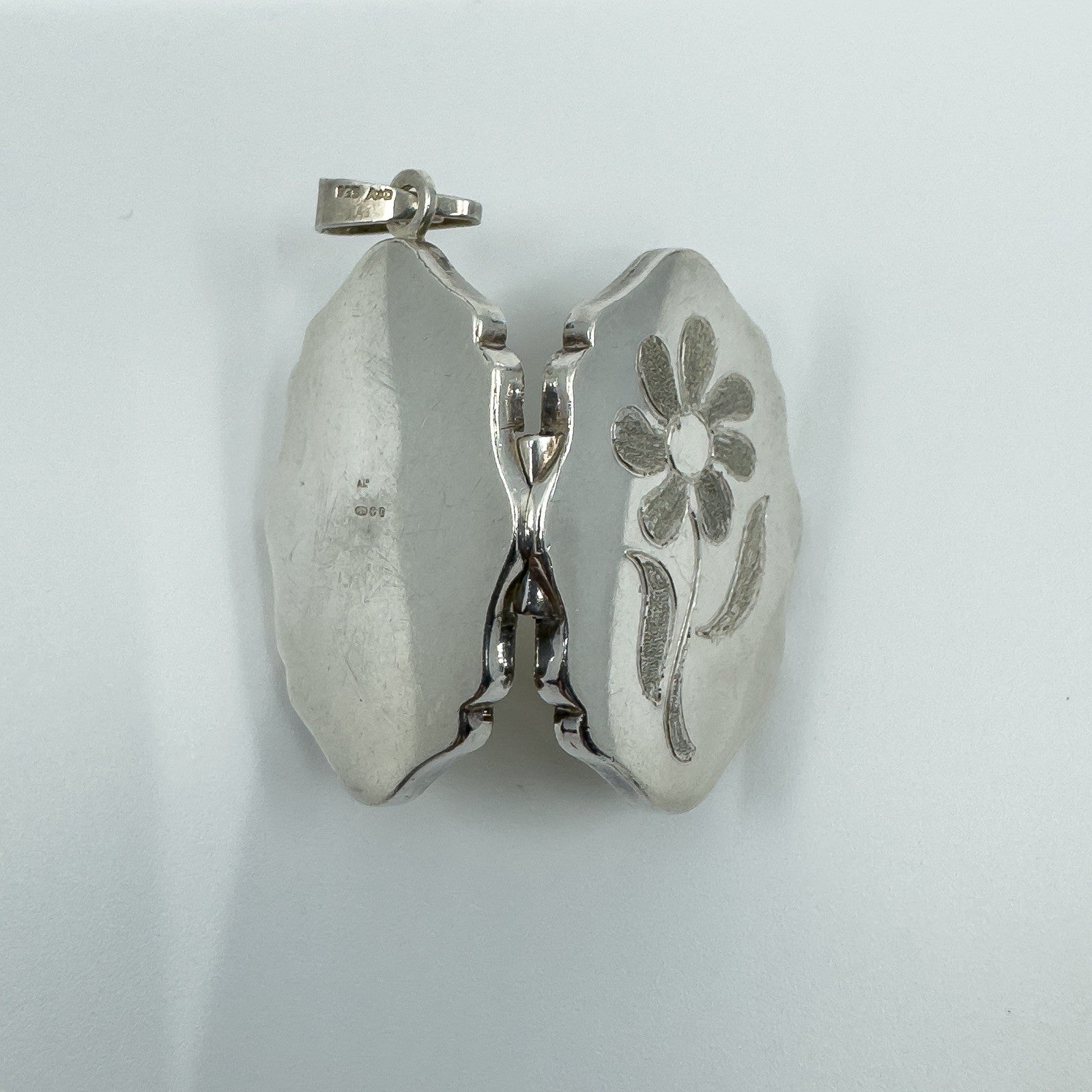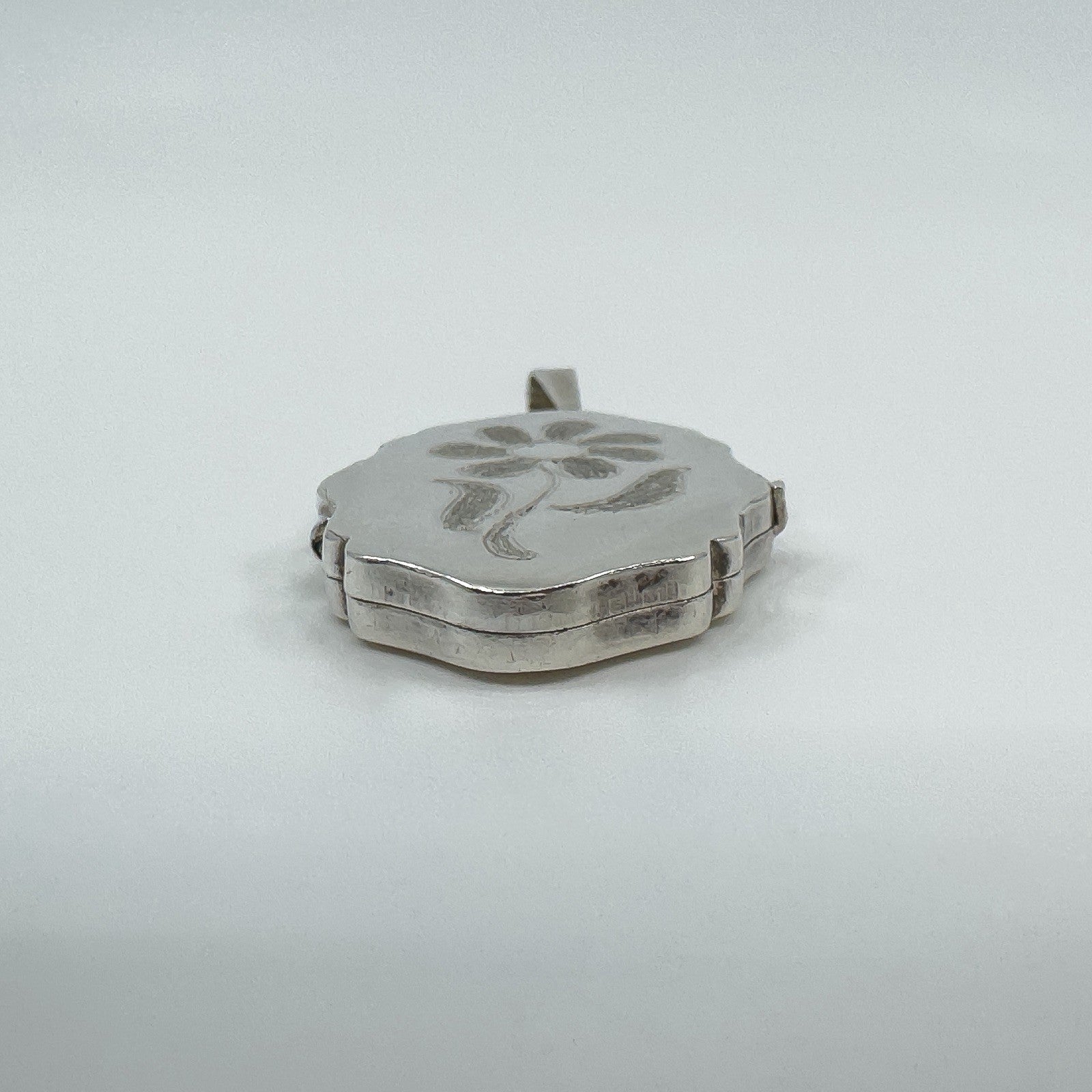 A vintage chunky sterling silver oval locket with a floral engraved front.