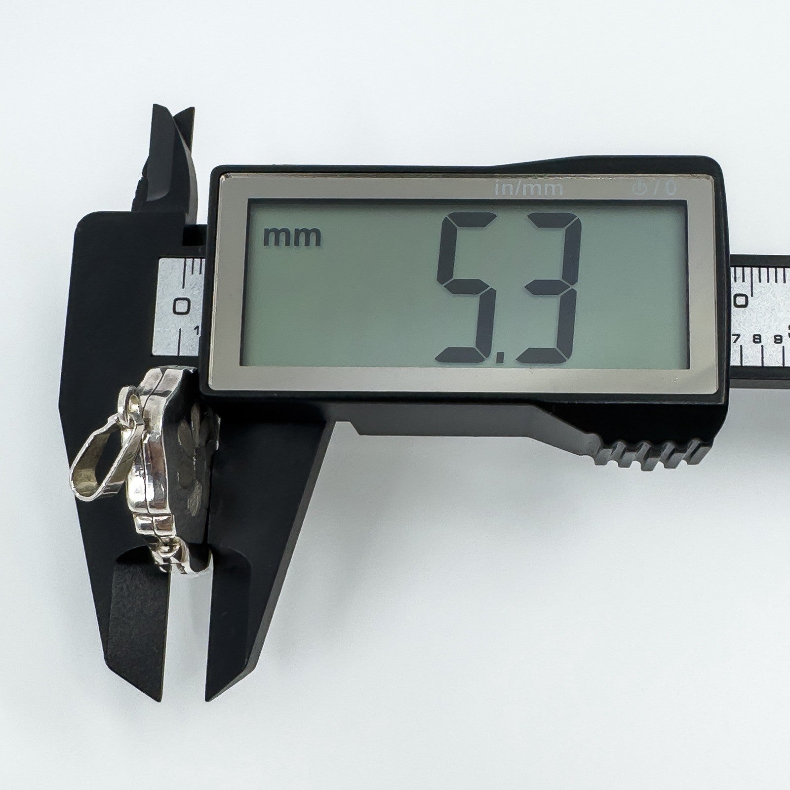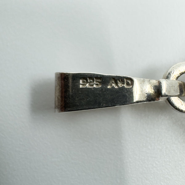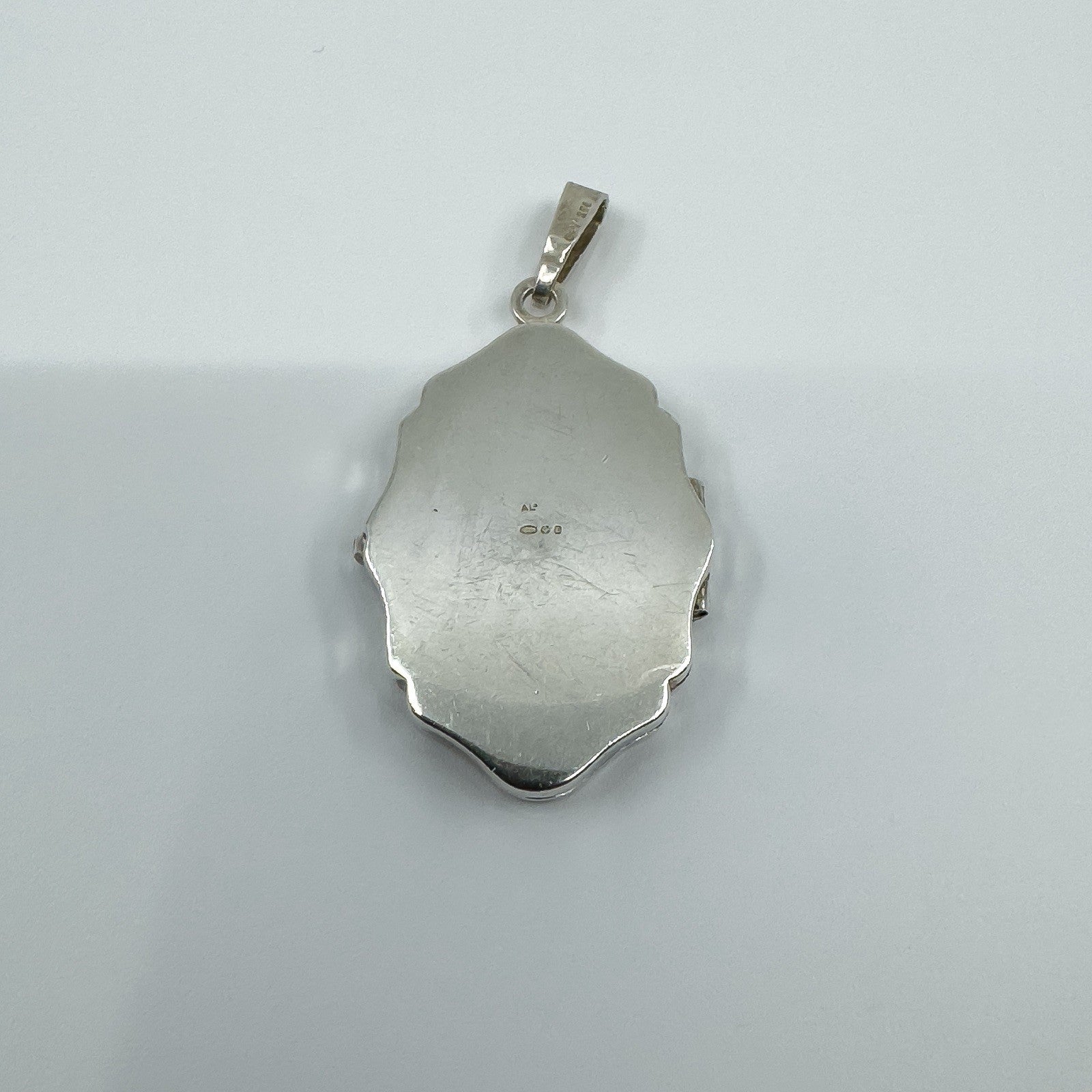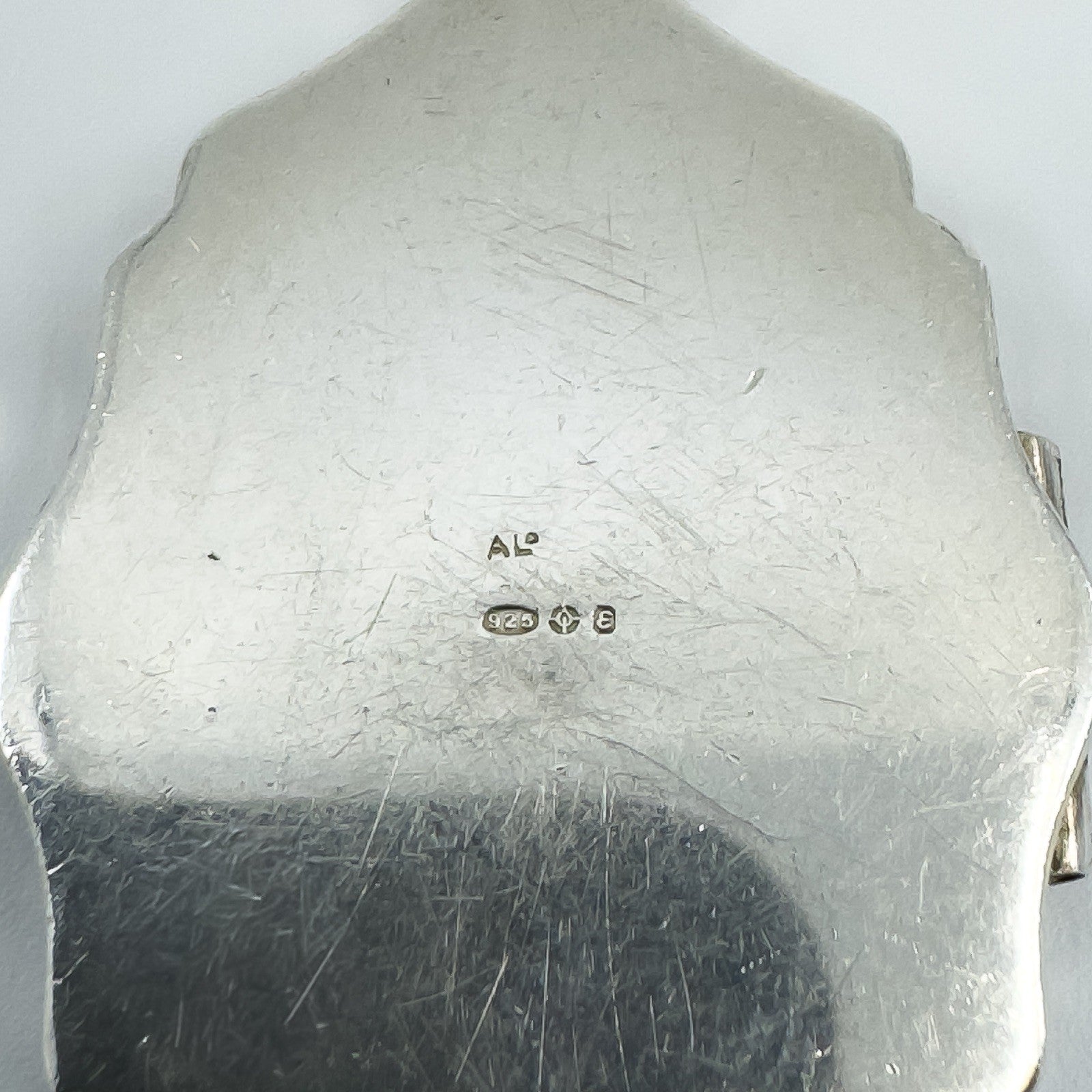 Stamped AL and 925 with UK import marks and date letter E (1979). Hinged; opens and closes securely with space for two photos.
