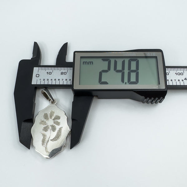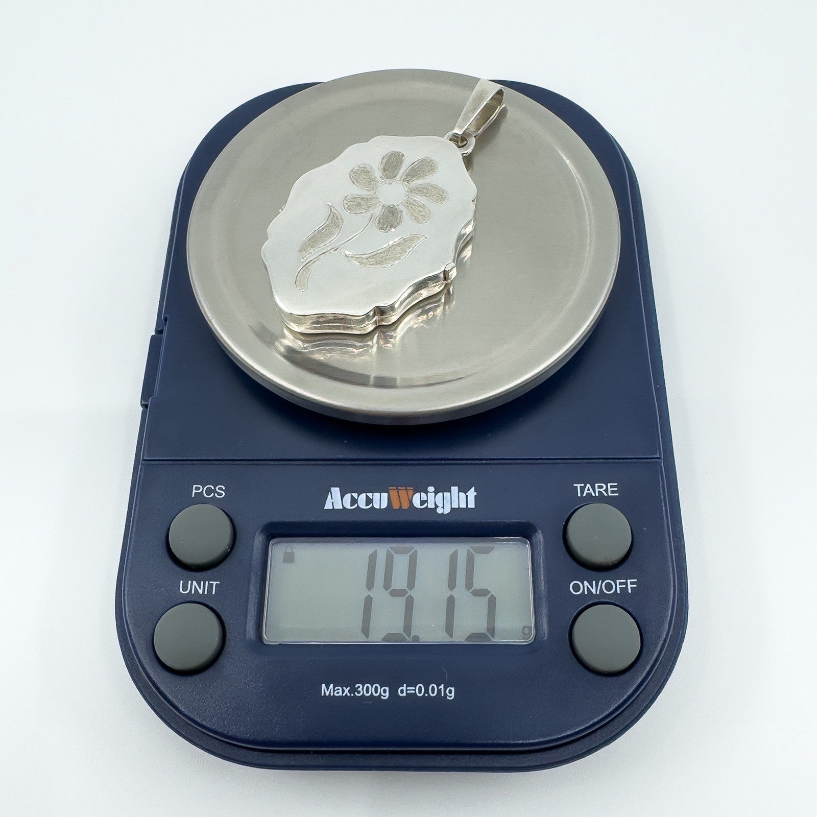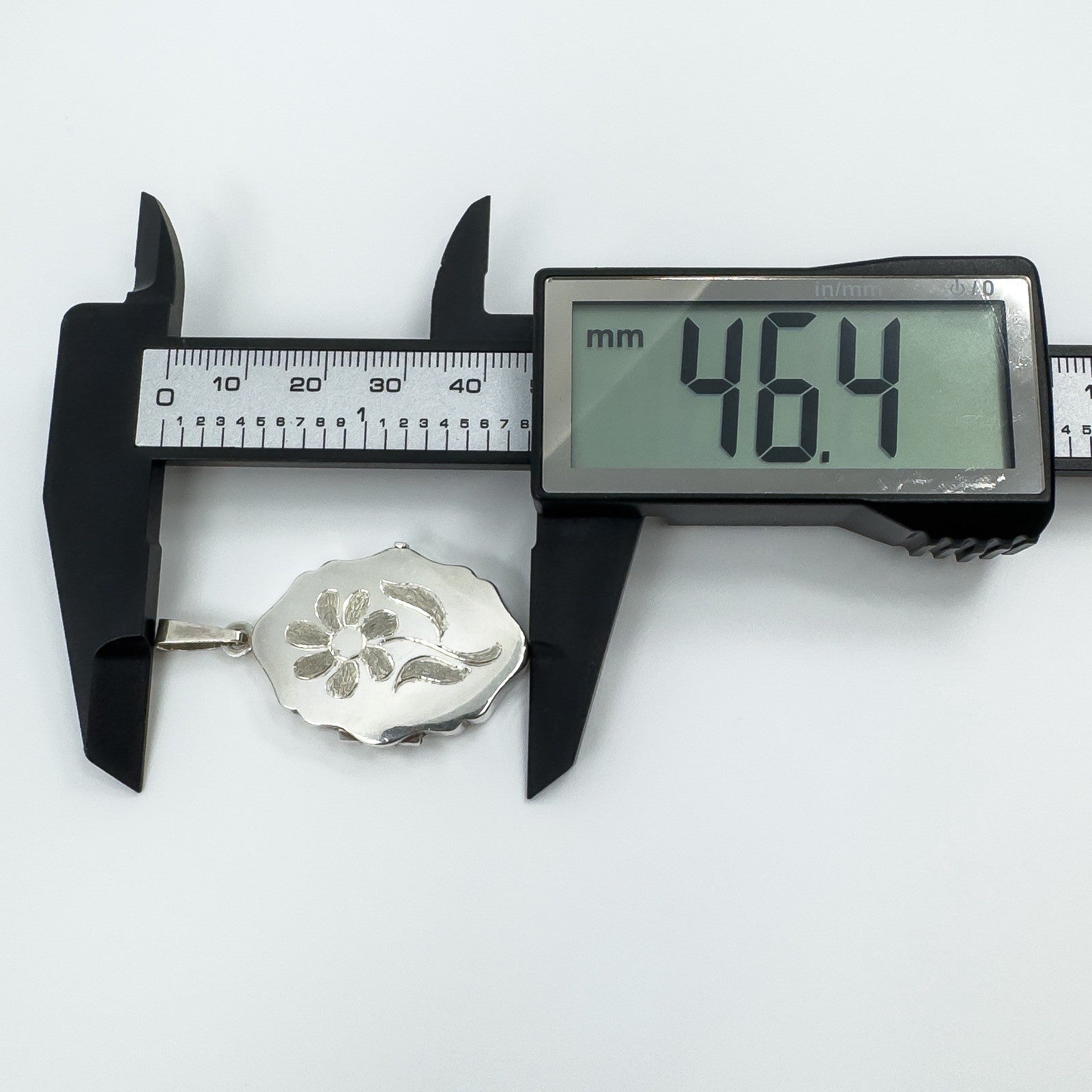 • Vintage chunky sterling silver oval floral engraved locket • Hinged; opens/closes securely; holds two photos • Stamped AL; 925; UK import marks; date letter E (1979) • Measures approx. 46.4 mm (with bail) × 24.8 mm × 5.3 mm • Weight approx. 19.1 g • Complete with bail (for a chain)