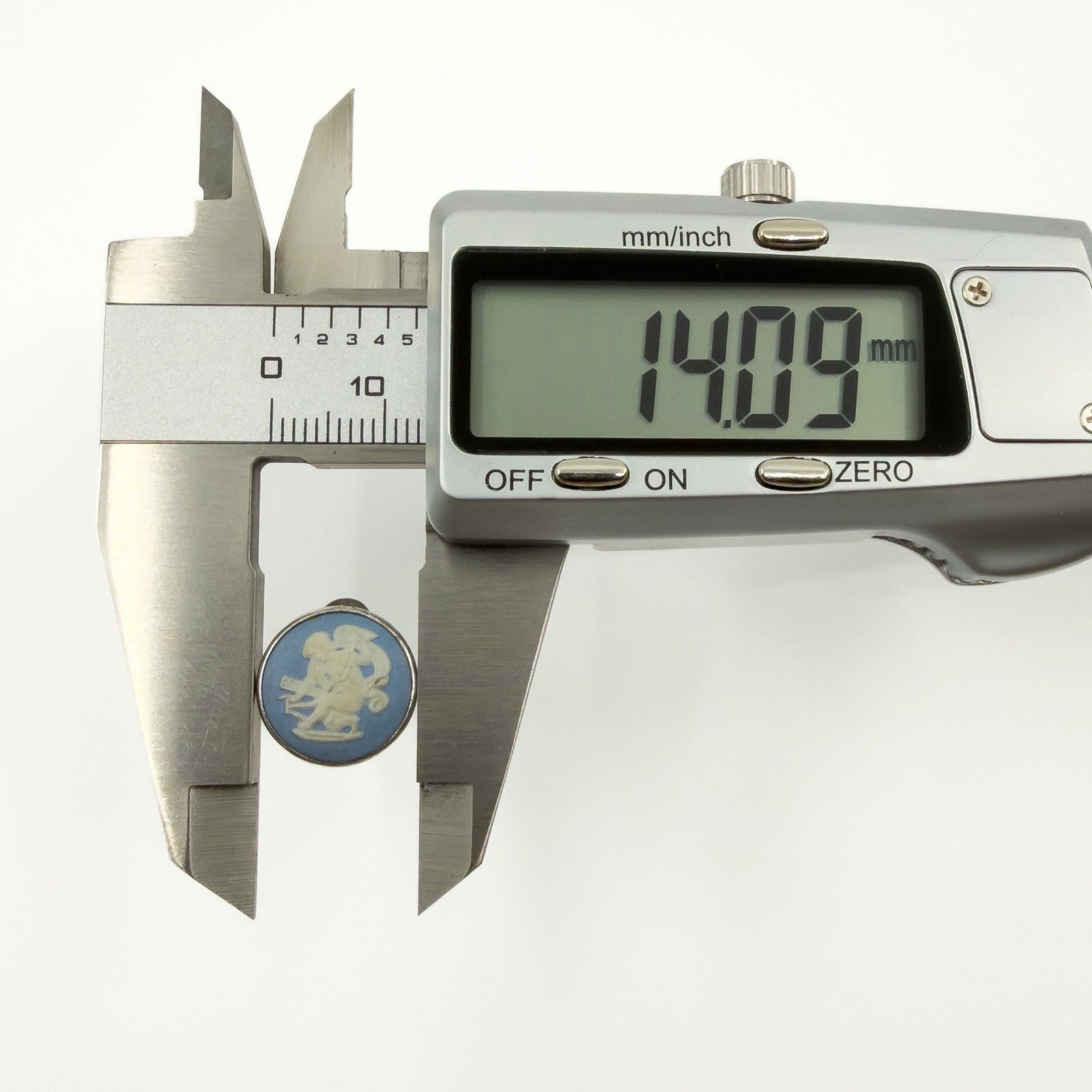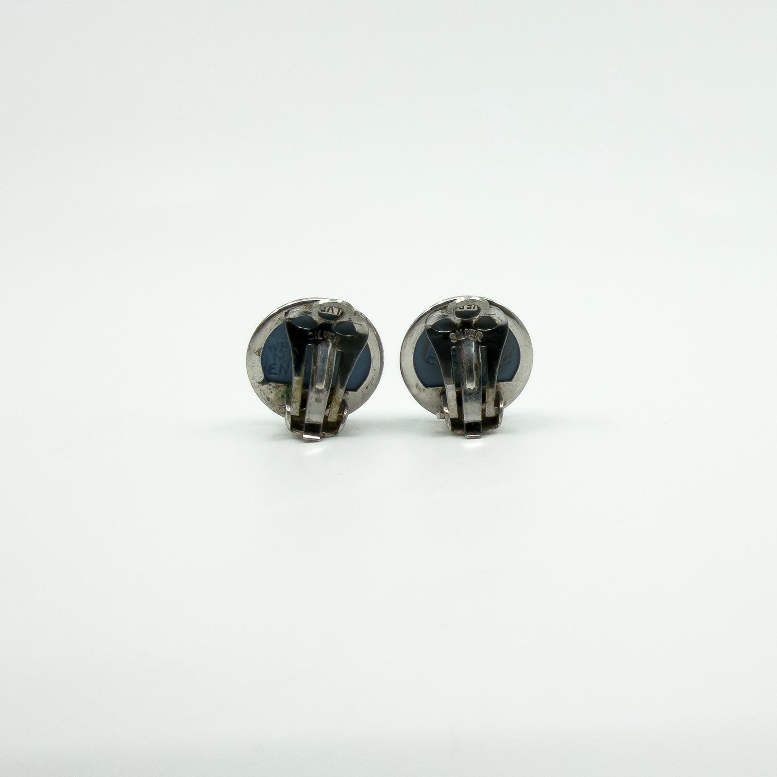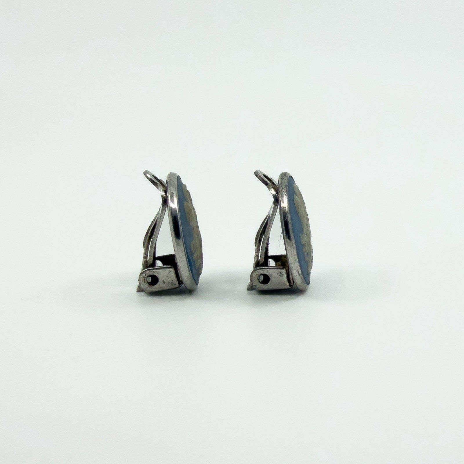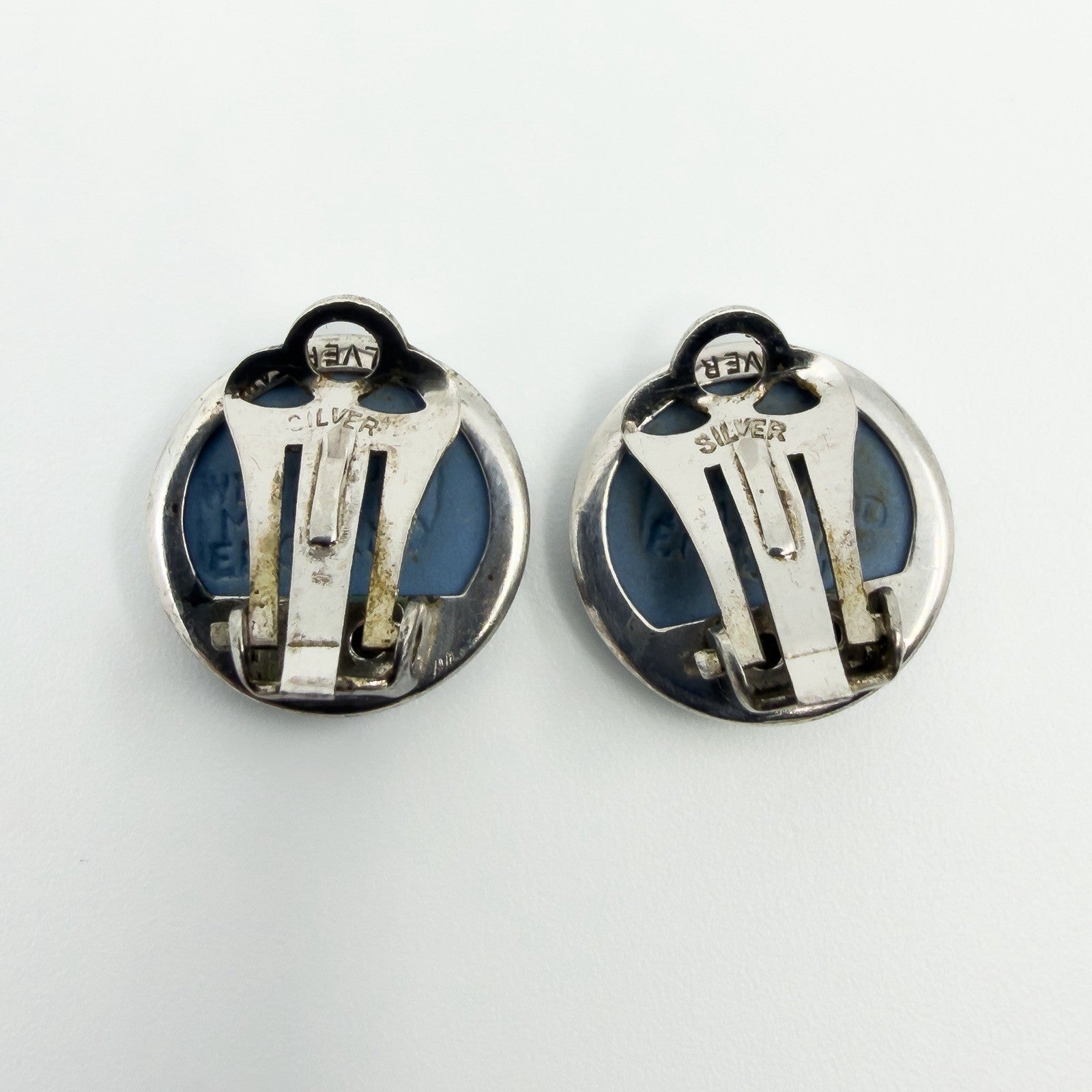 A vintage pair of sterling silver blue jasperware cameo clip-on earrings. They are stamped SILVER and have a classic round cameo design.