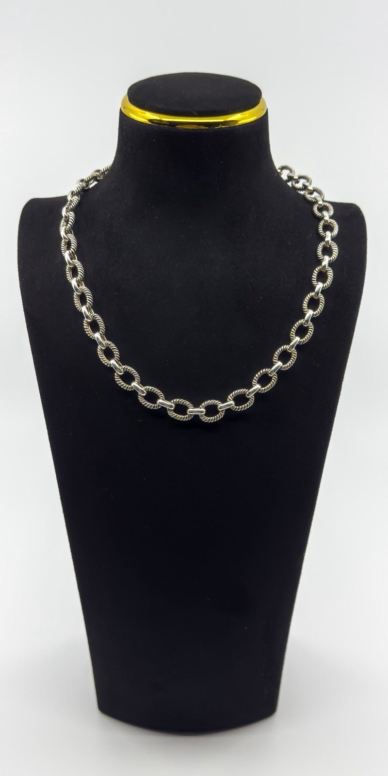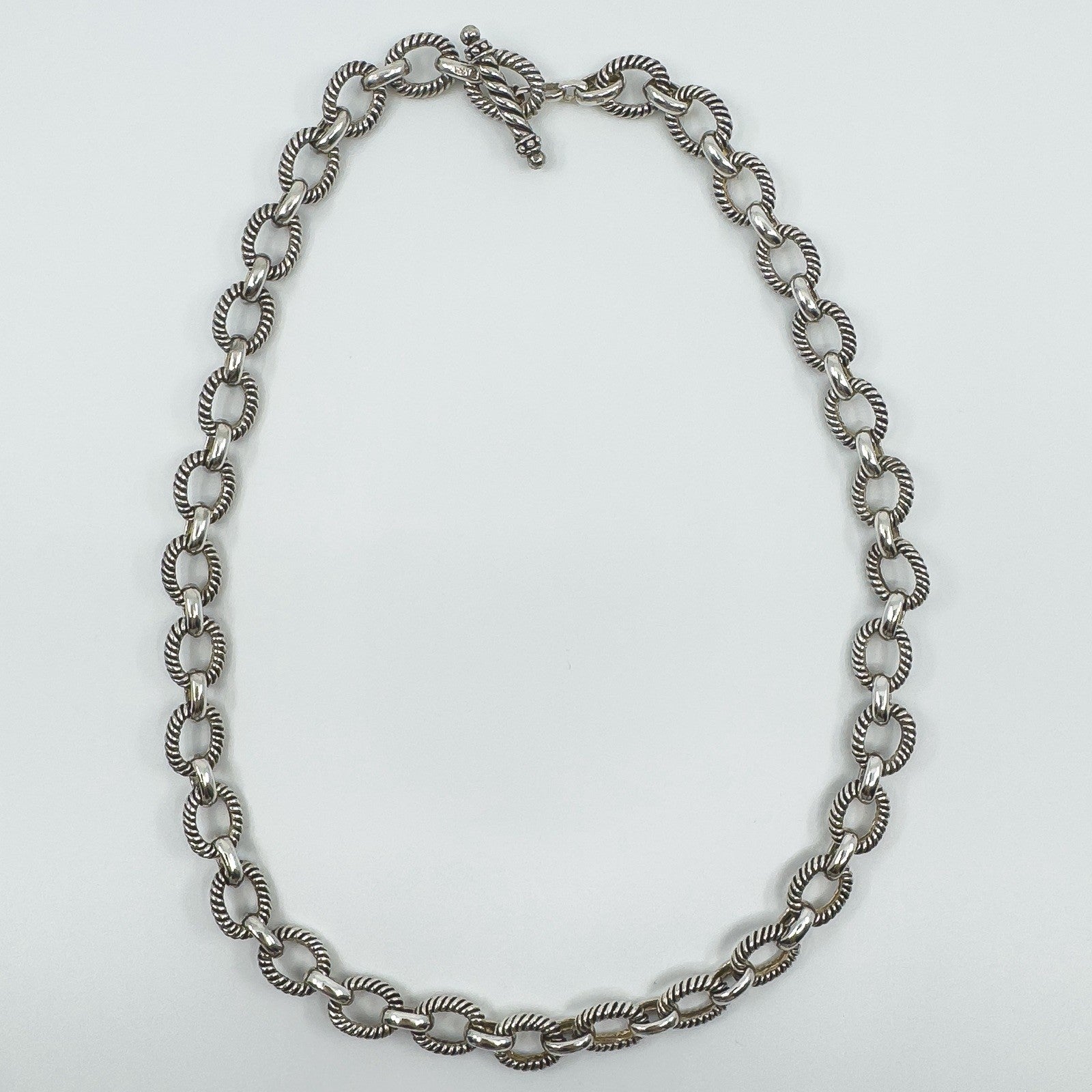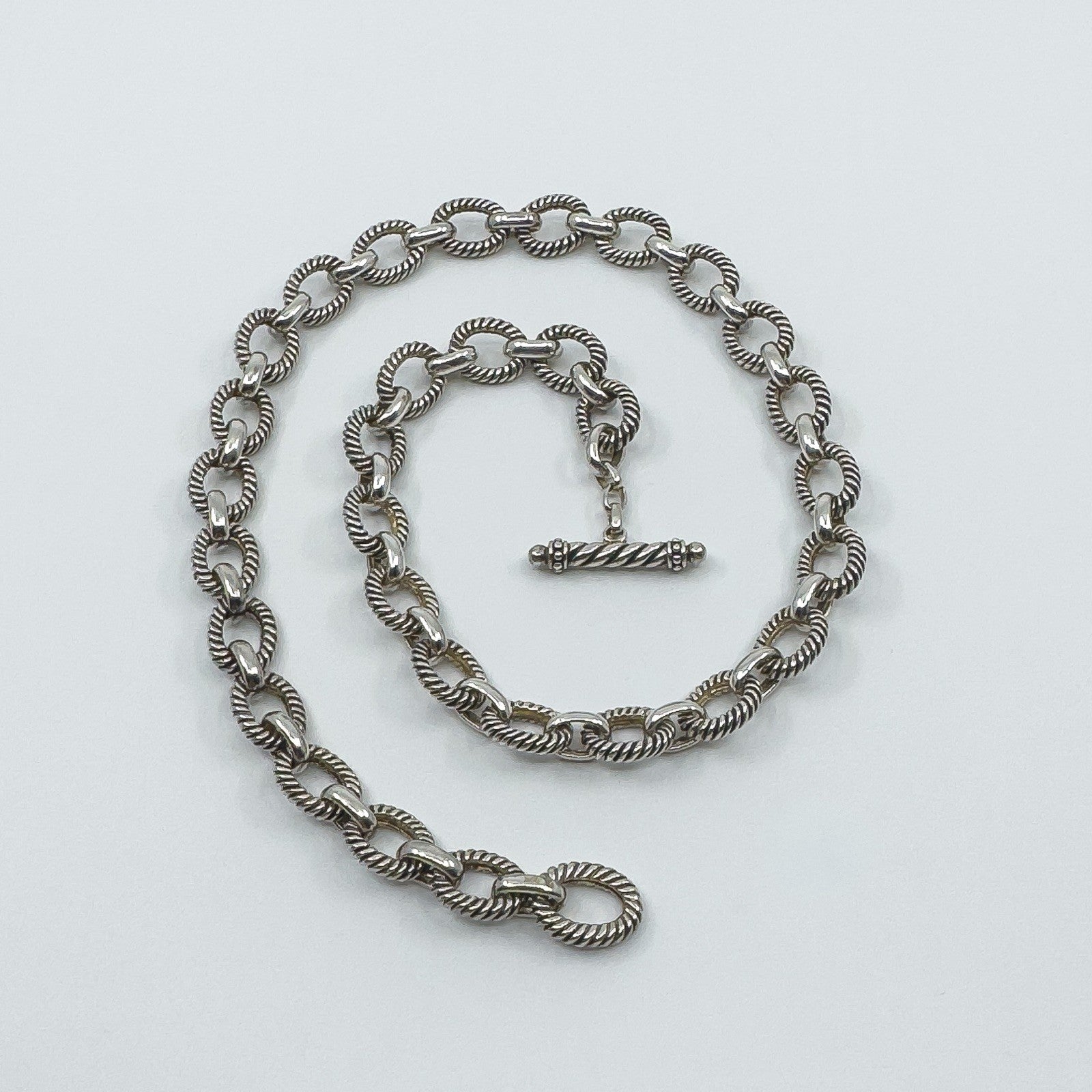 • Vintage sterling silver chunky fancy link chain with T-bar toggle closure • Textured oval links • Stamped QVC and 925 • Necklace length approx. 18.5 inches • Links approx. 9.6 x 2.5 mm • Weight approx. 50 g