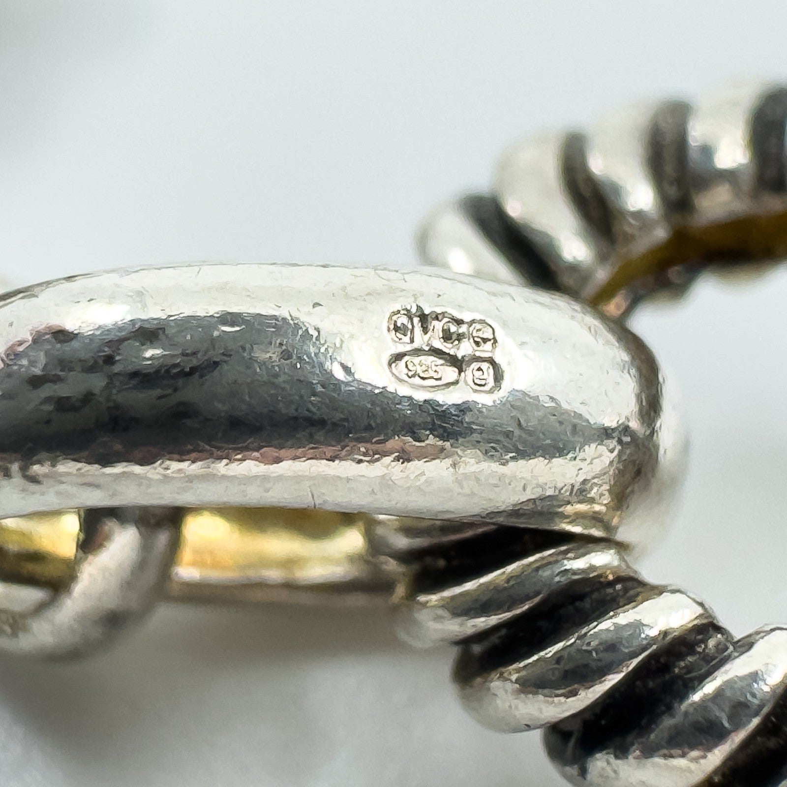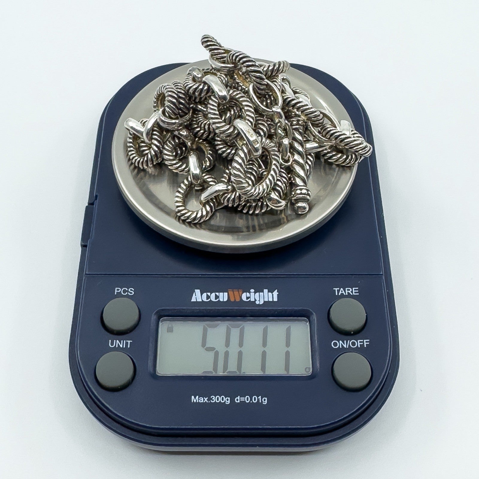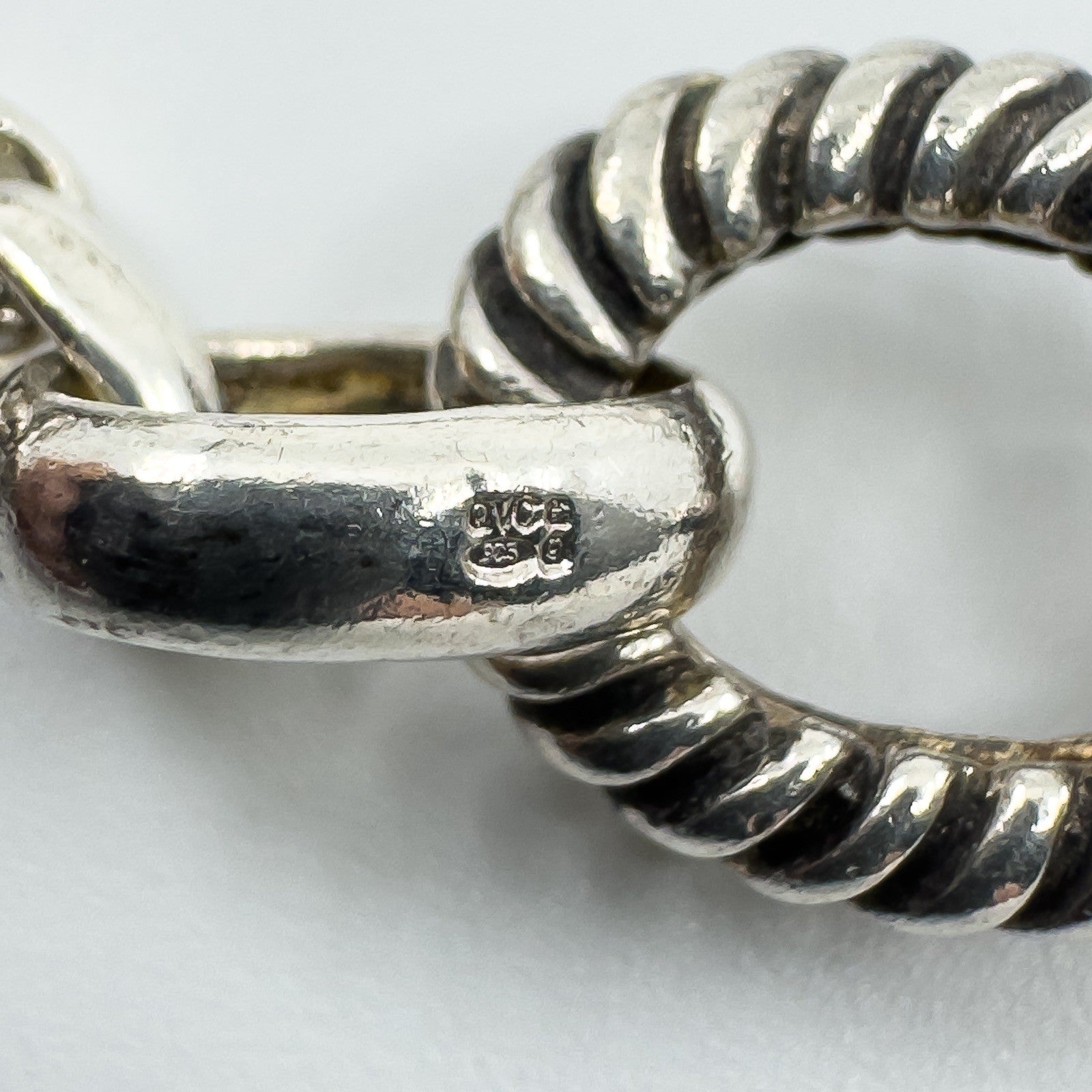 • Vintage sterling silver chunky fancy link chain with T-bar toggle closure • Textured oval links • Stamped QVC and 925 • Necklace length approx. 18.5 inches • Links approx. 9.6 x 2.5 mm • Weight approx. 50 g