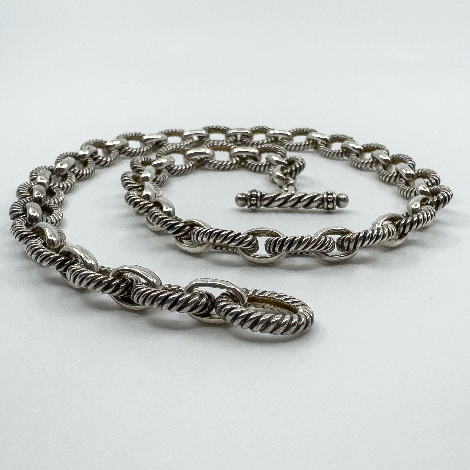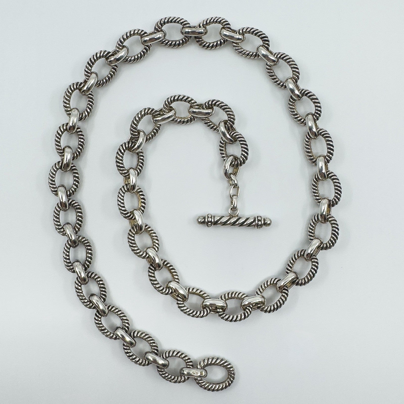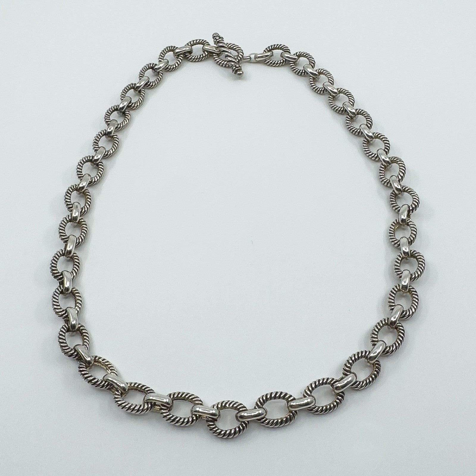 A vintage sterling silver chunky fancy link chain with textured oval links and a hoop and T-bar toggle closure.