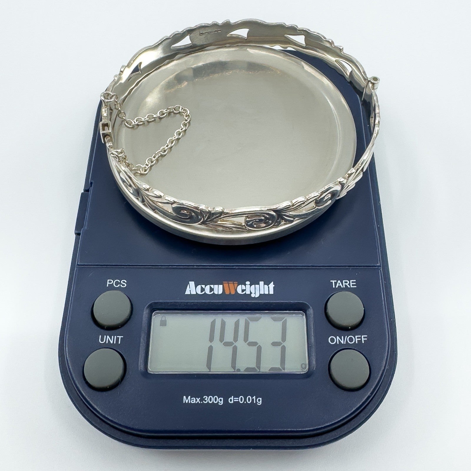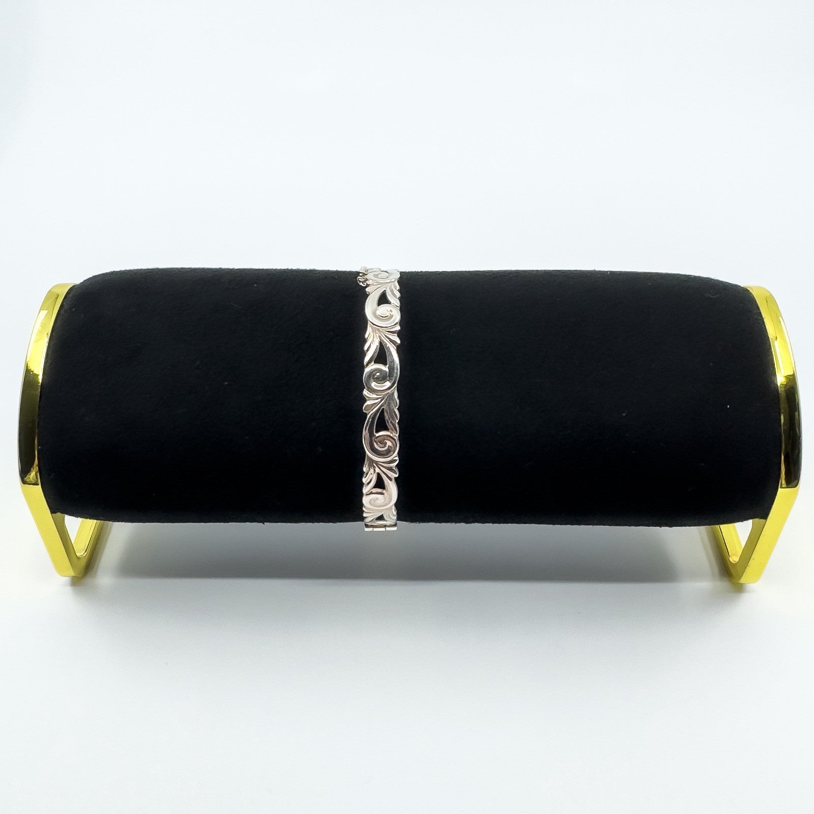 • Vintage sterling silver floral engraved oval bangle • Floral pattern engraved all the way around • Slide clasp with safety chain • Oval shape for a comfortable fit • Stamped BLTD, 925 and Anchor (Birmingham) • Width approx. 7.9 mm x 1.3 mm • Fits approx. 7 to 7.5 inch wrist • Weight approx. 14.5 g