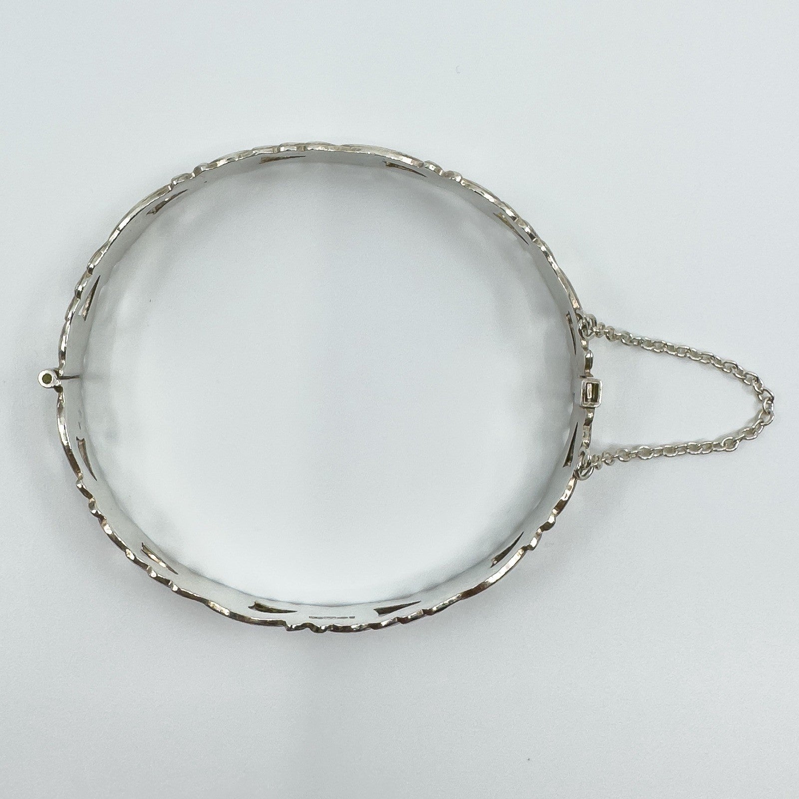 Fitted with a slide clasp and safety chain, and shaped oval for a comfortable fit. Stamped BLTD, 925 and the Birmingham anchor. It will fit a 7 to 7.5 inch wrist.