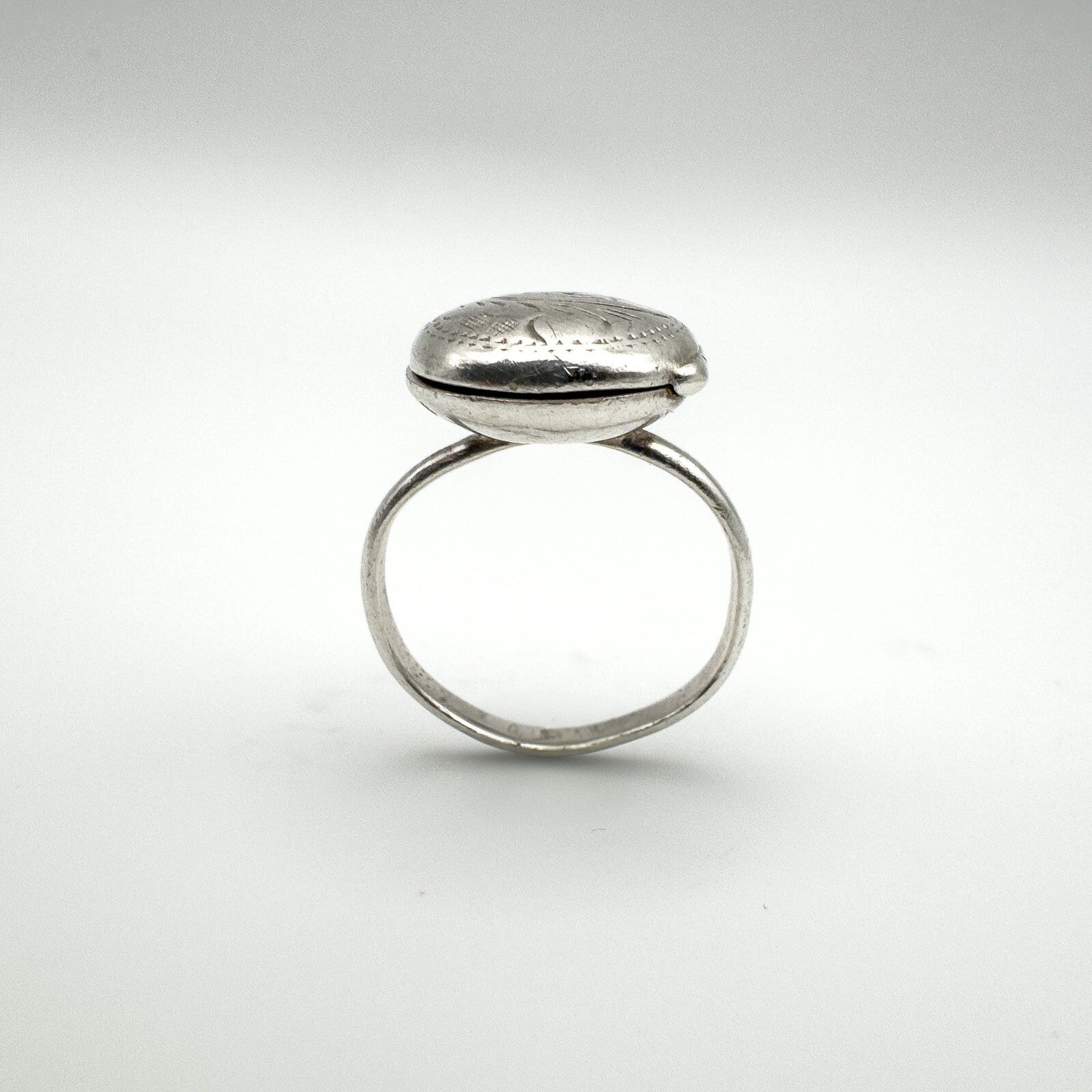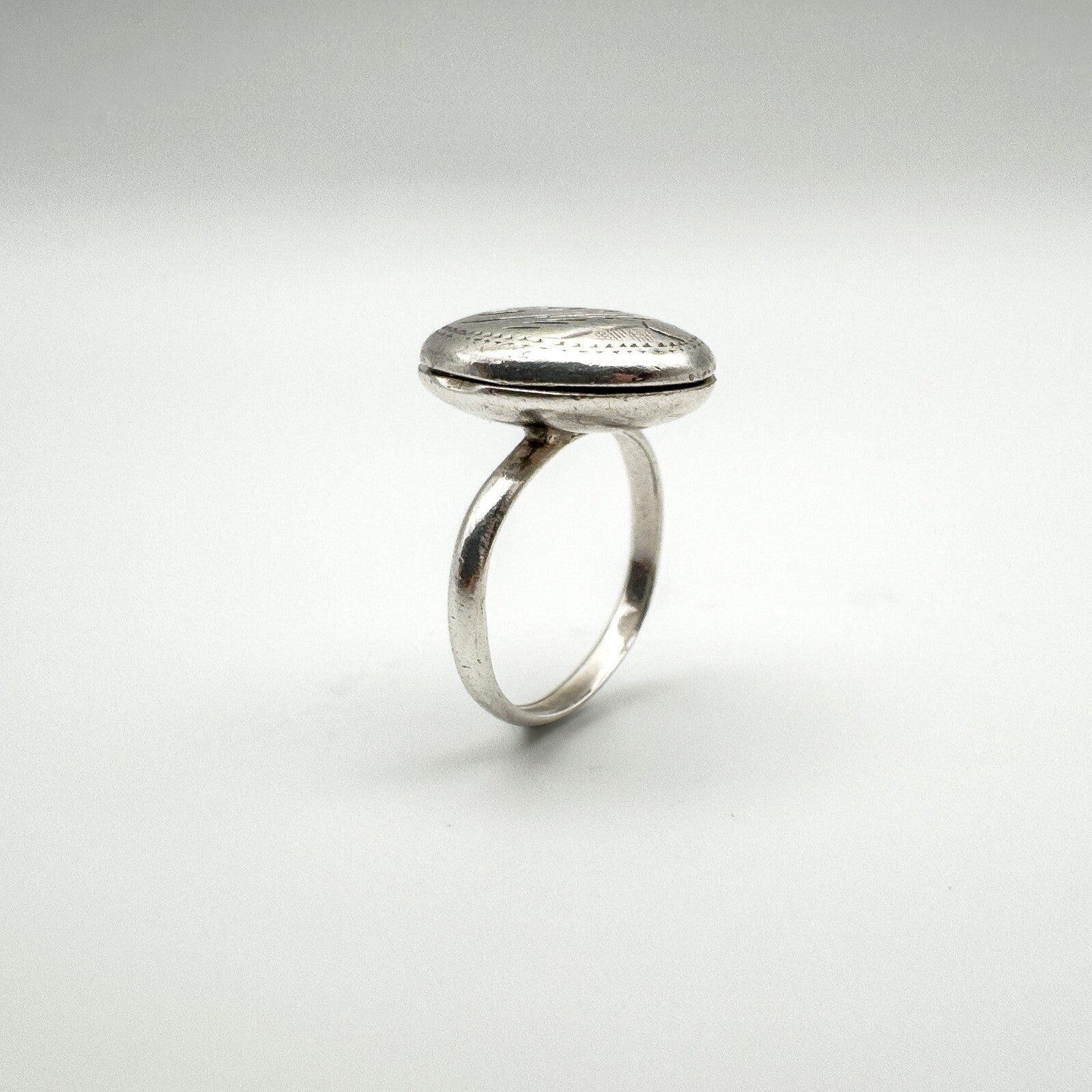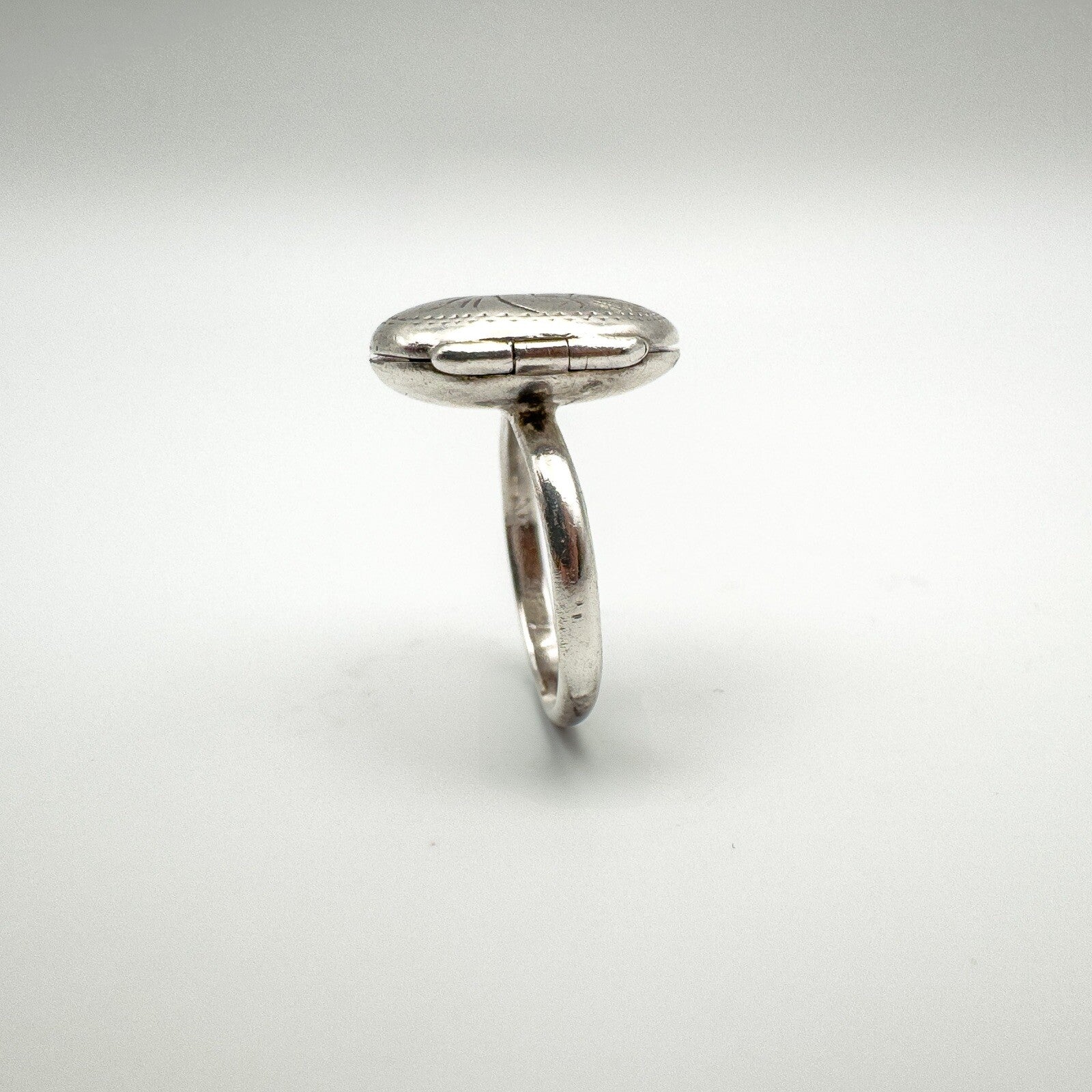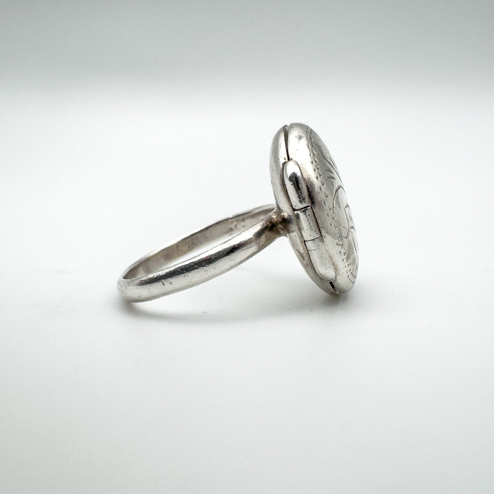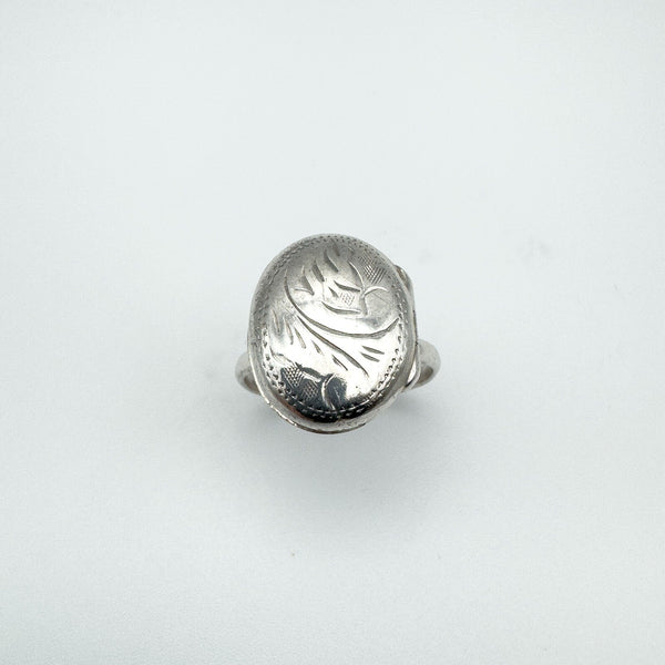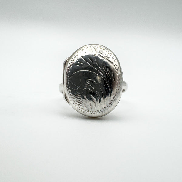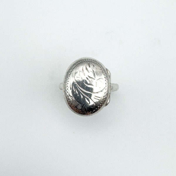 A vintage sterling silver secret locket ring, designed with an oval lid decorated in an engraved scroll motif. The hinged top opens and closes securely, making it a meaningful piece of jewellery with hidden detail.