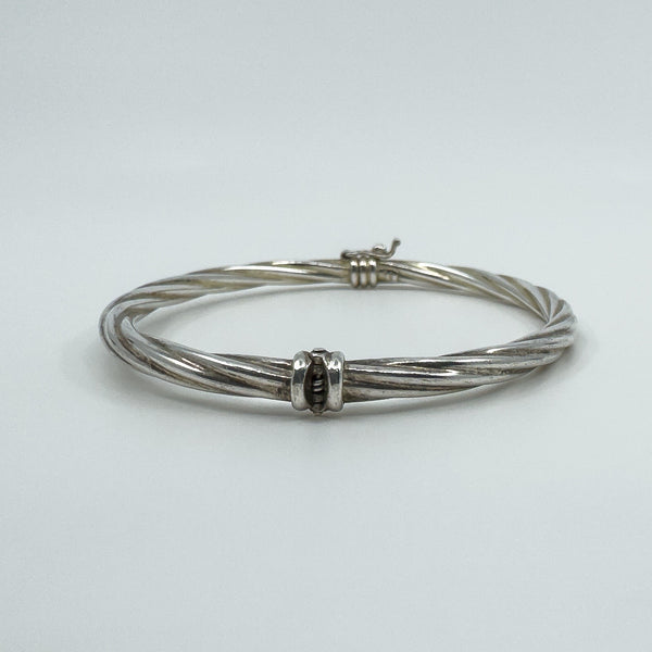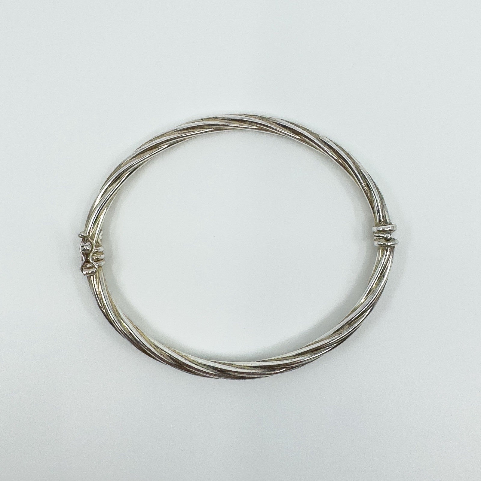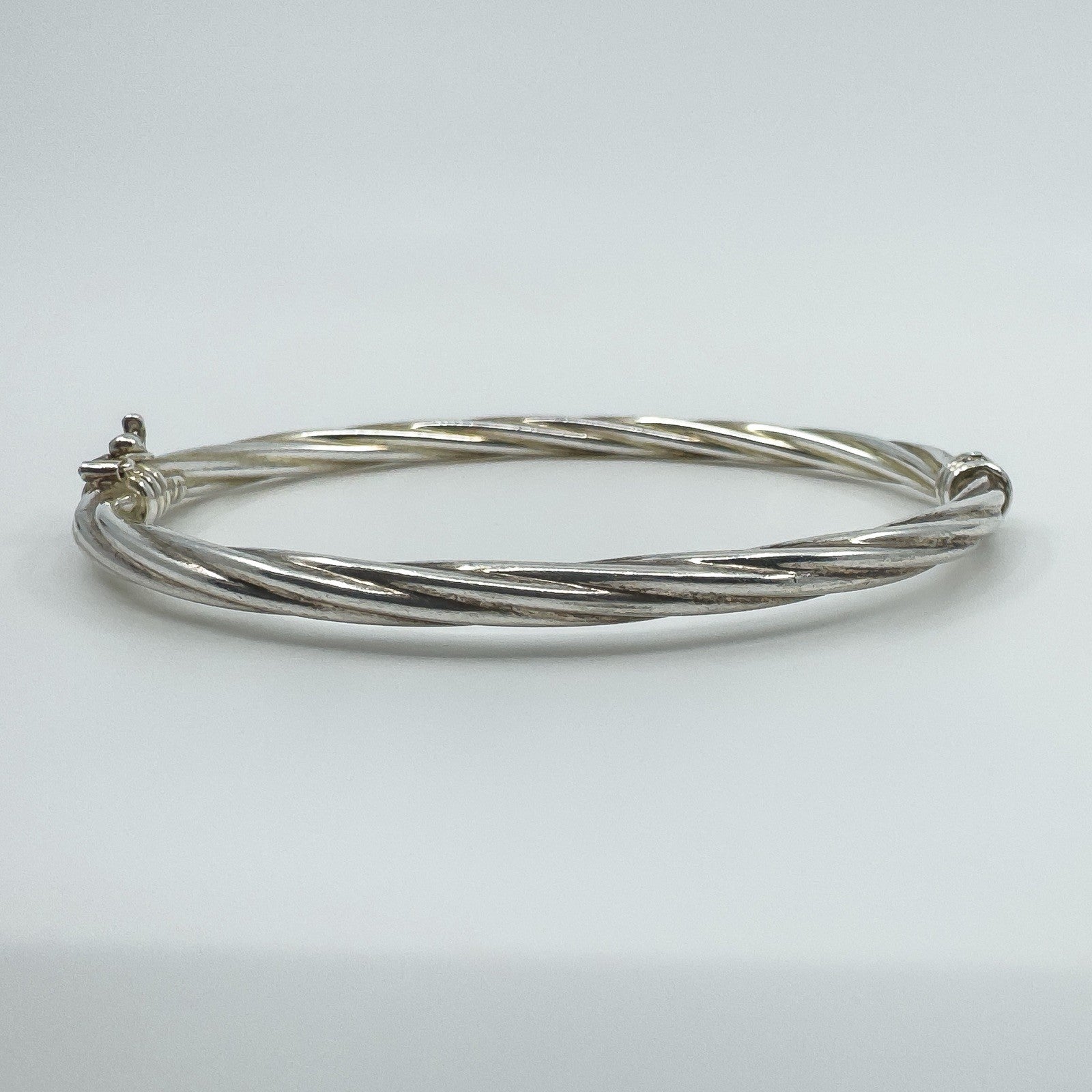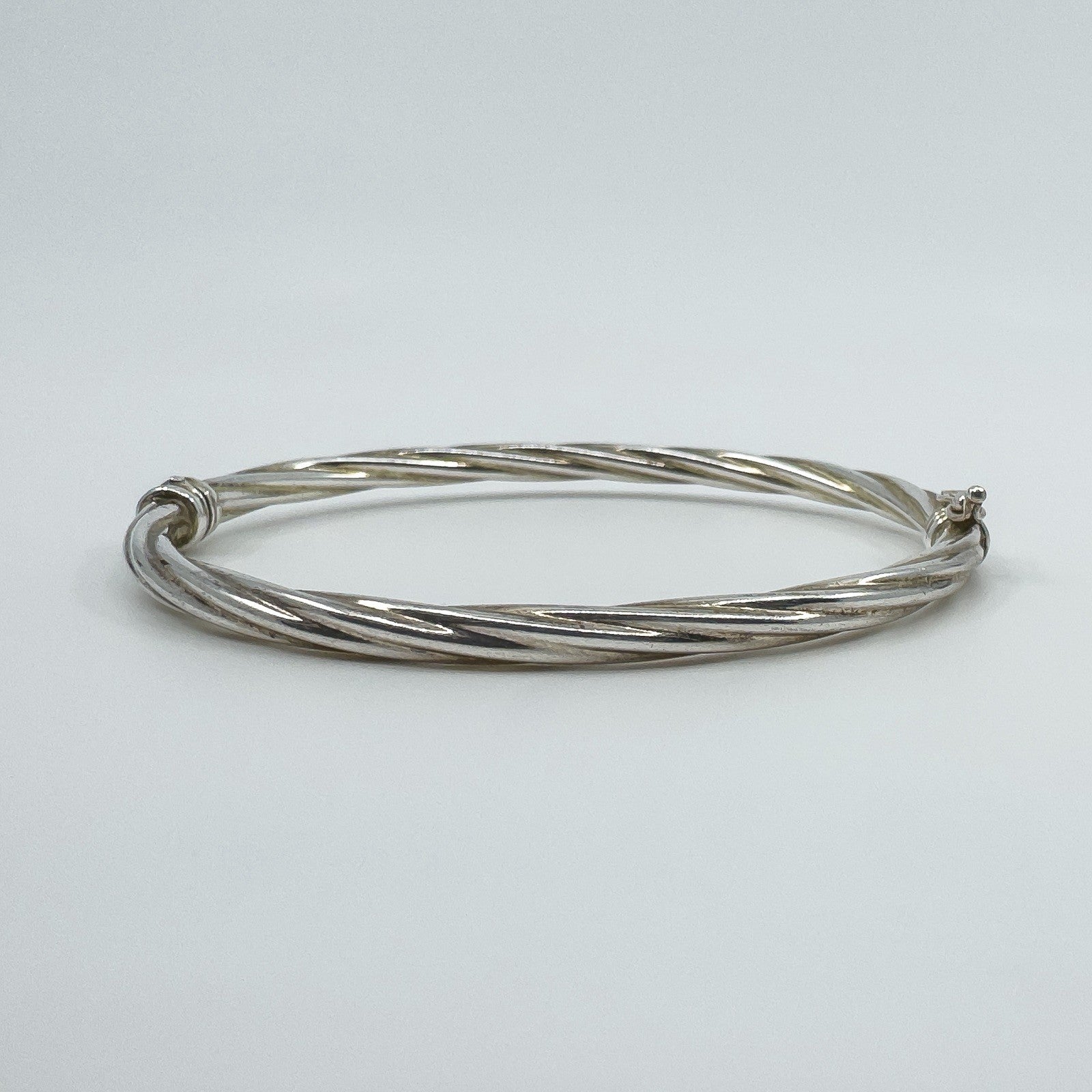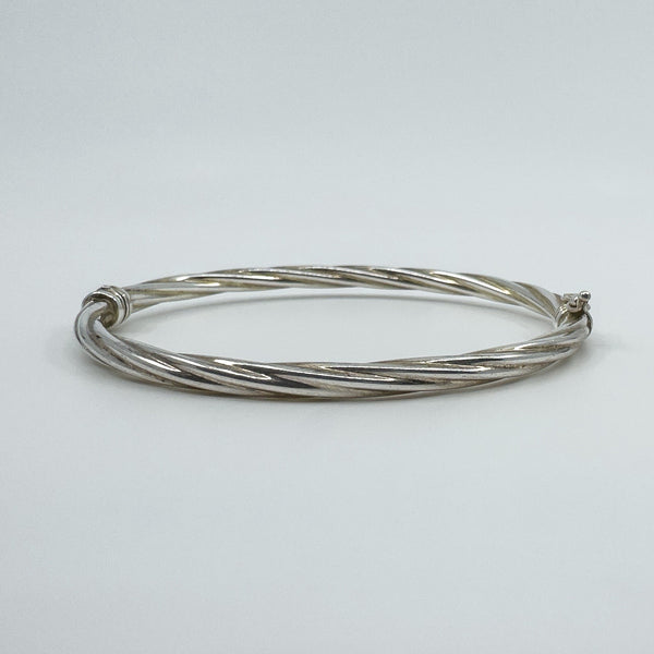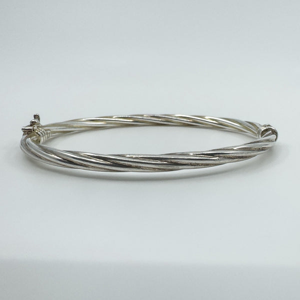 Vintage sterling silver twisted oval bangle bracelet with a simple, easy to wear design. The oval shape helps it sit neatly on the wrist.