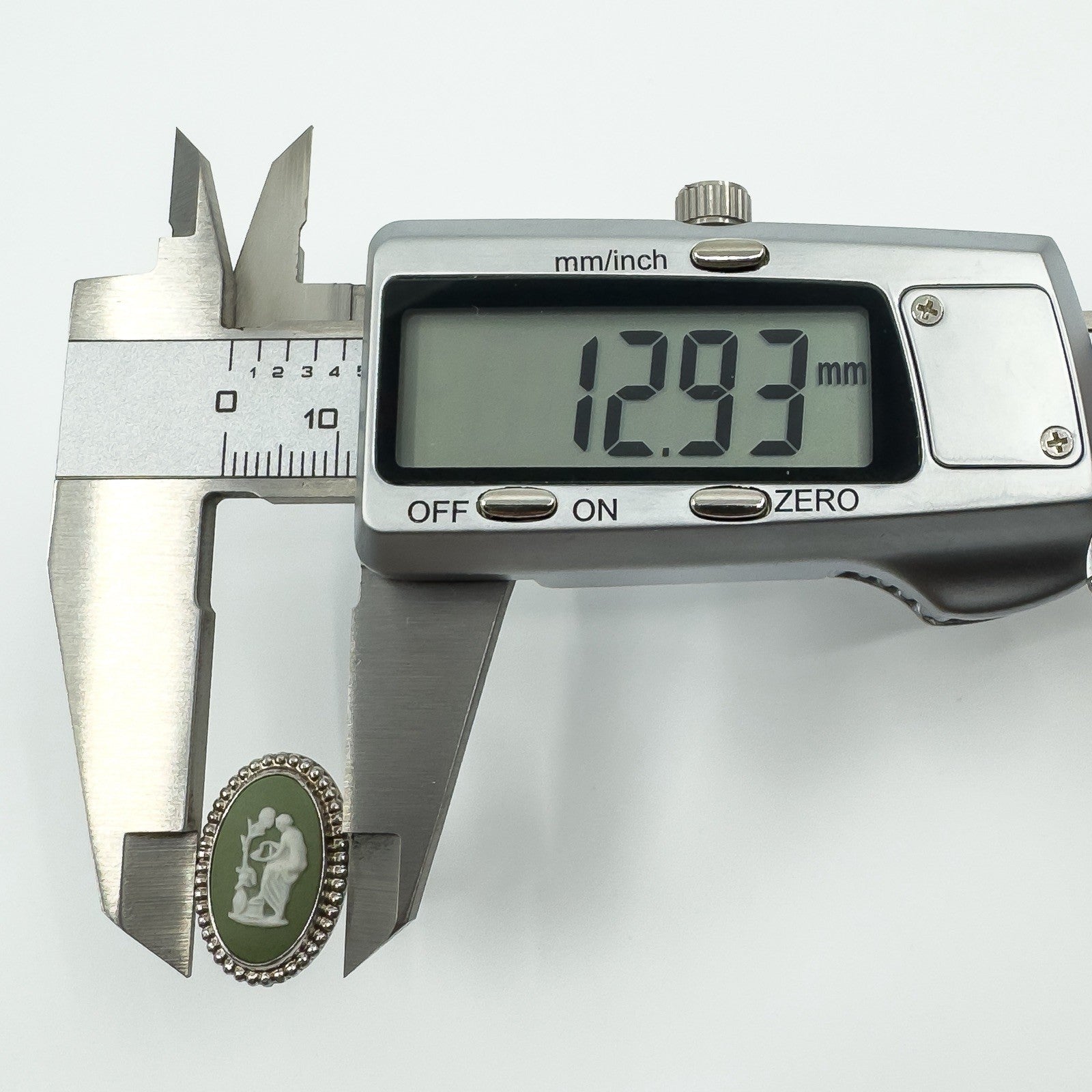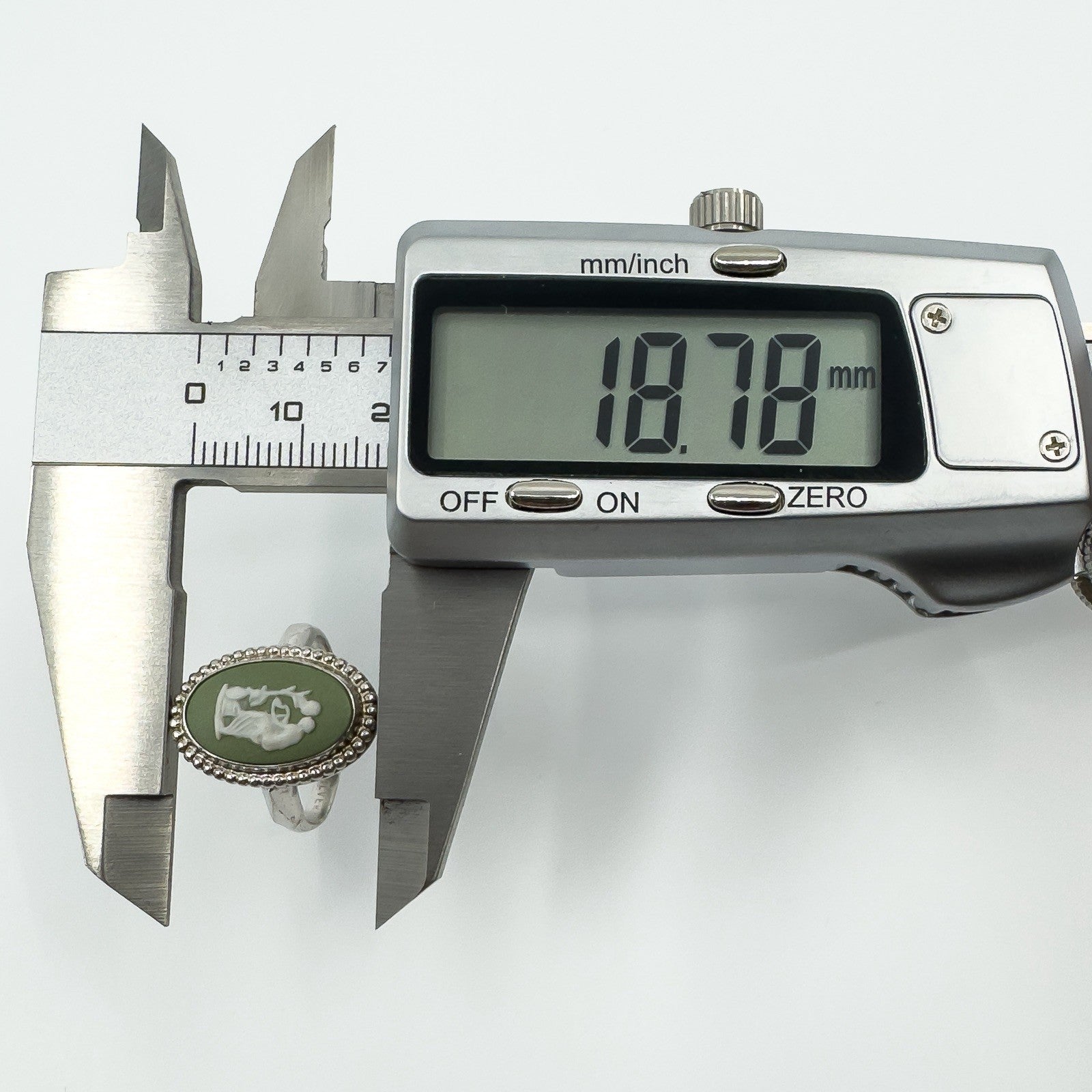 • Item: Wedgwood green jasperware cameo ring • Metal: Sterling silver • Stamps: WEDGEWOOD, MADE IN ENGLAND, STERLING SILVER • Ring size: Size N - O • Head size: Approx. 18.7mm x 12.9mm • Head depth: Approx. 4.8mm • Band width (underside): Approx. 2.3mm • Weight: Approx. 4.1g