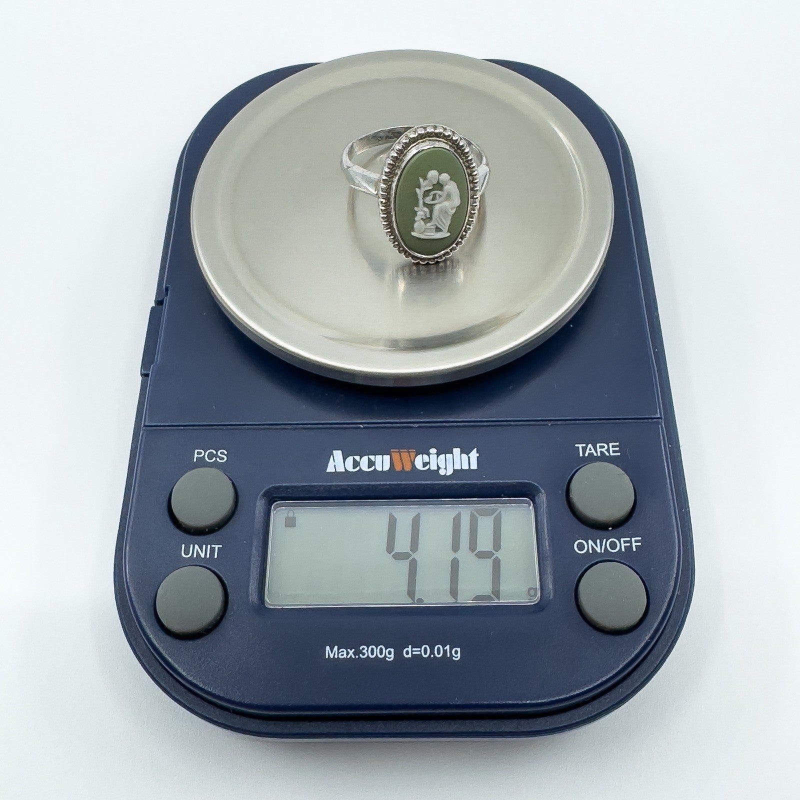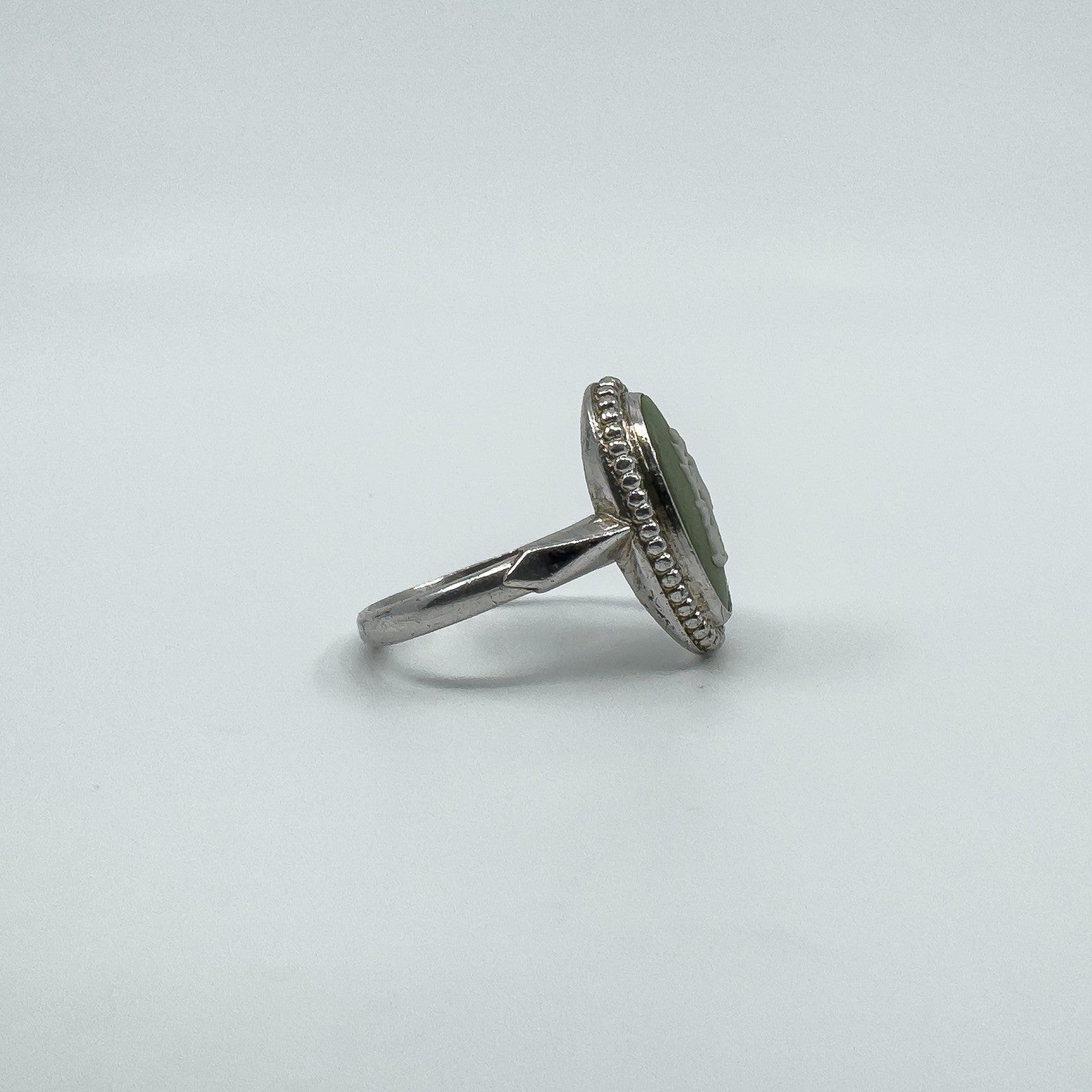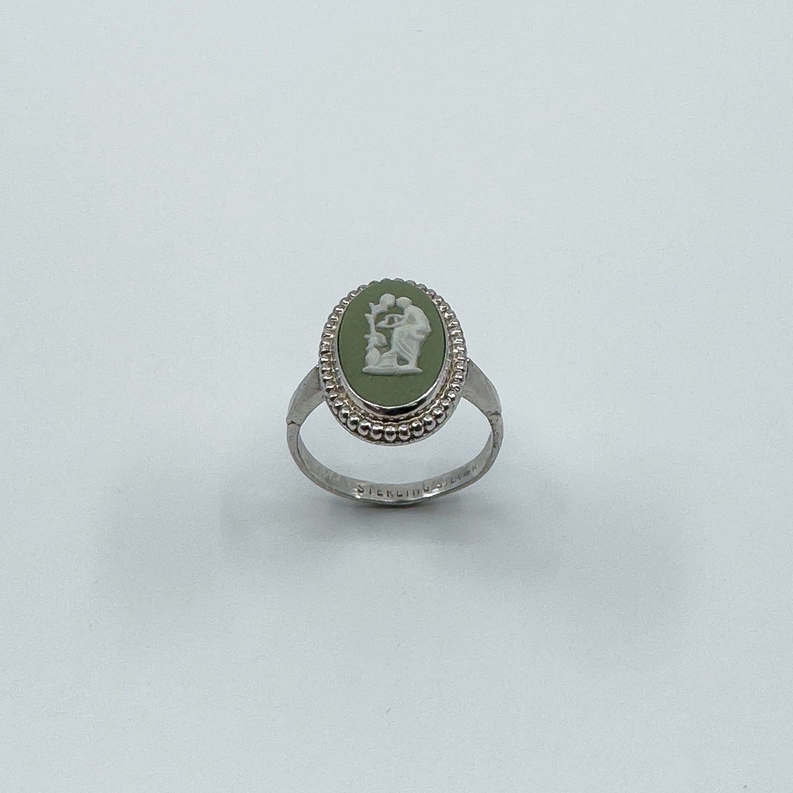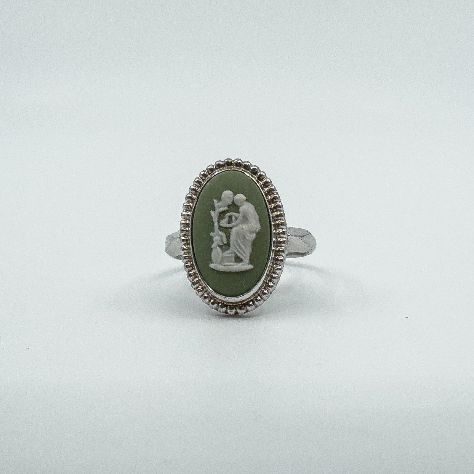 Vintage Wedgwood green jasperware cameo ring set in sterling silver. Stamped WEDGEWOOD, MADE IN ENGLAND and STERLING SILVER.