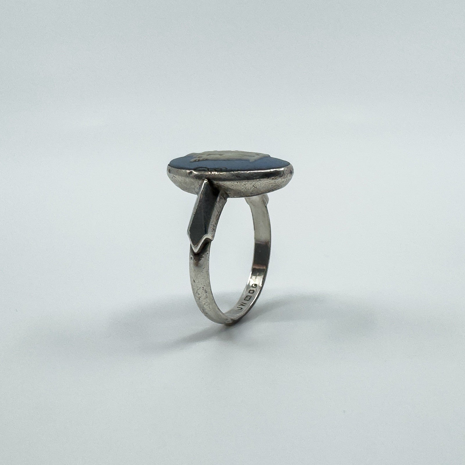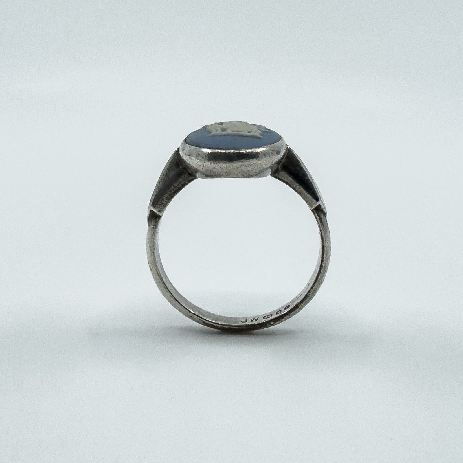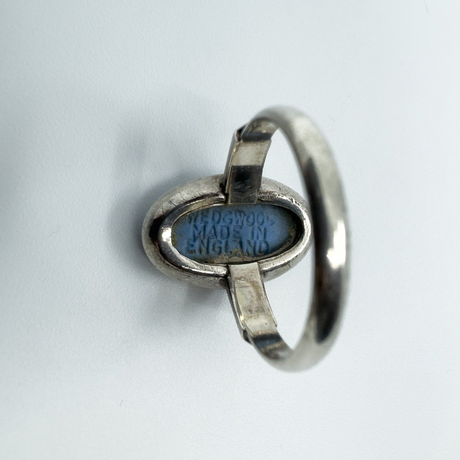 Vintage Wedgwood blue jasperware cameo ring in sterling silver. Stamped WEDGEWOOD, MADE IN ENGLAND, JW, and hallmarked London 1972. There are very minor cracks to the edge on one side, barely noticeable.