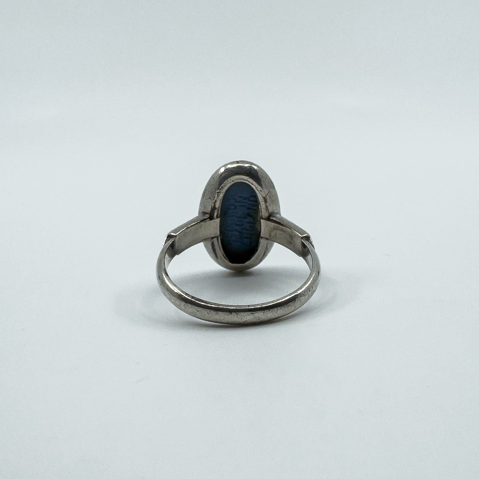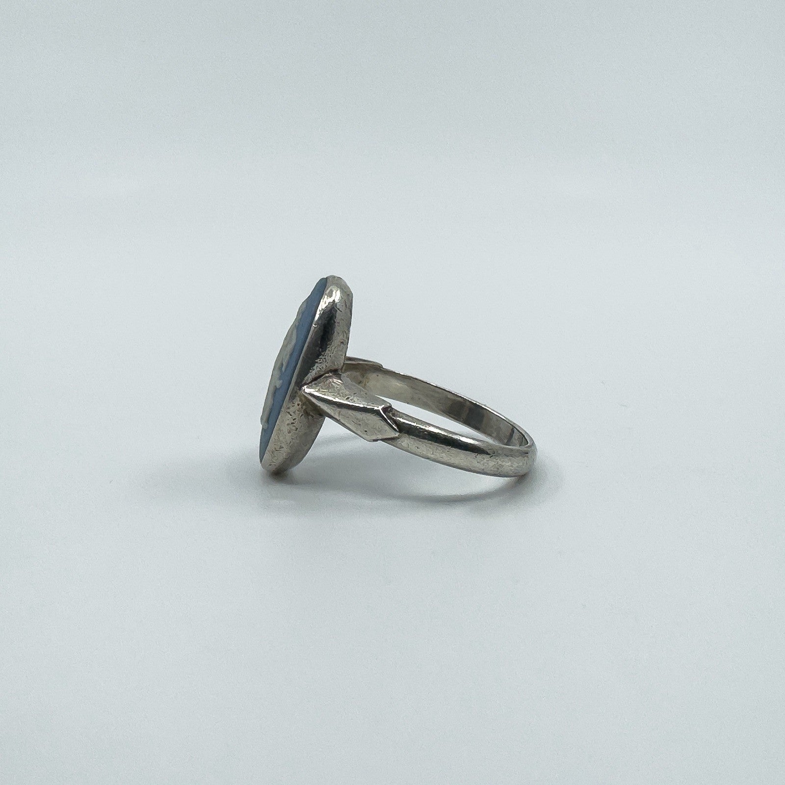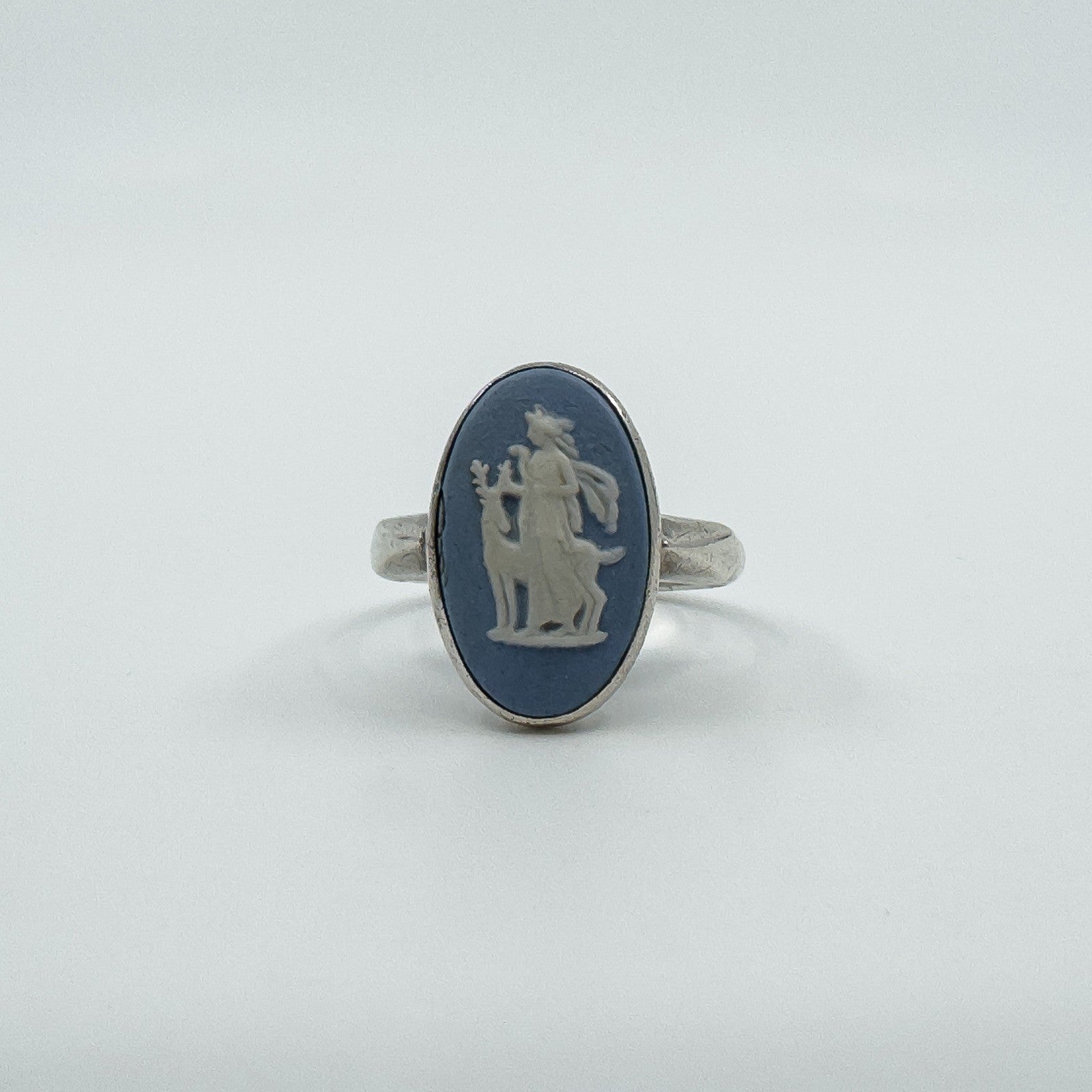 Vintage Wedgwood blue jasperware cameo ring in sterling silver. Stamped WEDGEWOOD, MADE IN ENGLAND, JW, and hallmarked London 1972. There are very minor cracks to the edge on one side, barely noticeable.