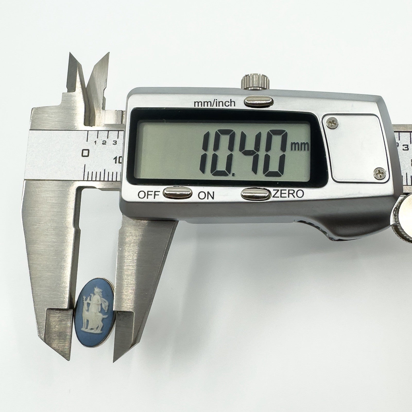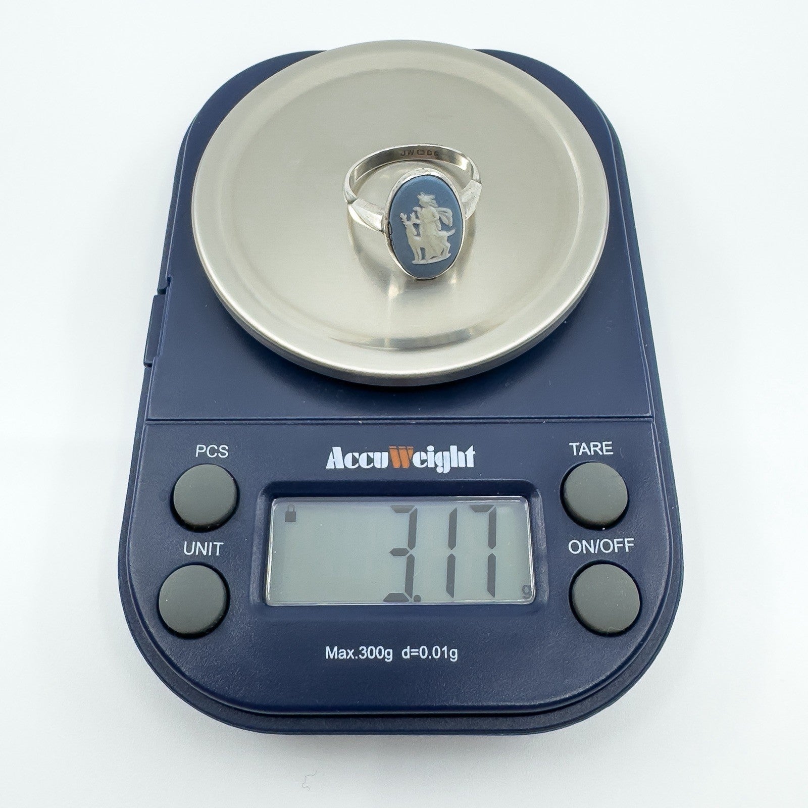 • Item: Wedgwood blue jasperware cameo ring • Metal: Sterling silver (925) • Stamps and hallmarks: WEDGEWOOD, MADE IN ENGLAND, JW, lion passant, leopard head, date letter r (London 1972) • Ring size: Size J - K • Head size: Approx. 16.1mm x 10.4mm • Head depth: Approx. 4.5mm • Band width (underside): Approx. 2.4mm • Weight: Approx. 3.1g